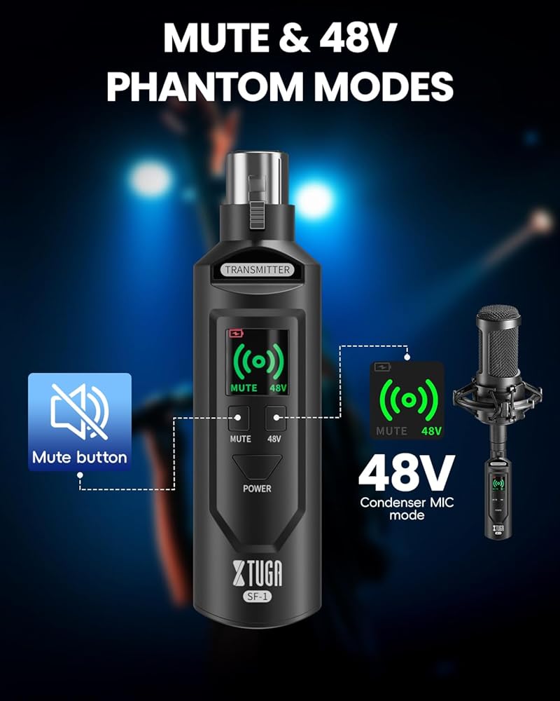 XTUGA 2.4GHz Wireless XLR Transmitter & Receiver, Wireless Microphone Adapter System for Dynamic/Condenser Mics w/ 48V Phantom Power fit for Live Show,Audio Mixer,PA Systems,Studio,Church (SF-1)