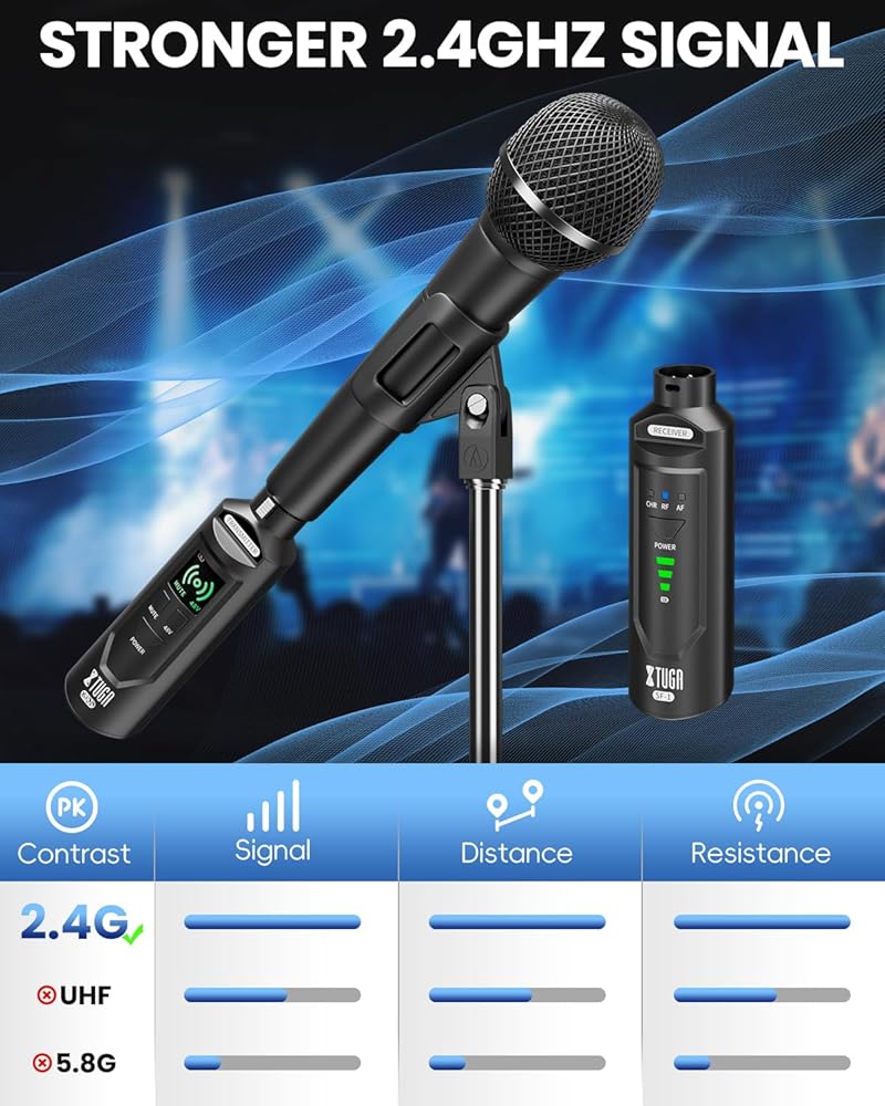 【Upgraded 2.4GHz Wireless Mic Adapter】: XTUGA professional wireless xlr transmitter and receiver engineered for musicians,singers and band.Featuring with low latency, 24-bit audio resolution, and 48K sampling frequency.Ideal for professional recording, live streaming, and stage performances where clarity and authenticity are critical.