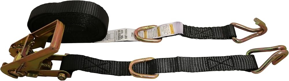 Ratchet Strap, 16' x 1", Heavy Duty 1,000 lb. Working Load Limit, Wire Double J-Hooks, Floating D-Rings, Open Handle Ratchet with 15" Fixed End, Gold Chromate Finish for Contractor Loads