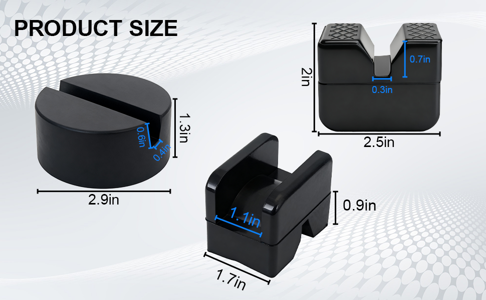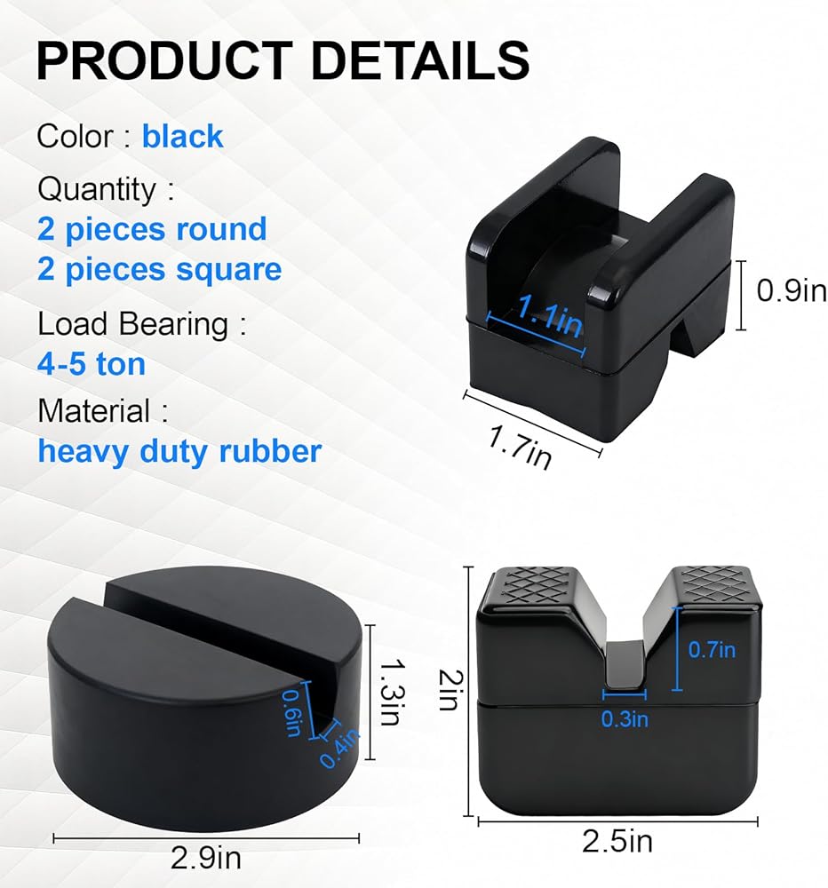 • Adequate to Meet Your Needs:Our jack pads are capable of supporting 2-3 ton capacities. Each set includes 4 packs.Tip: The rubber material has a little rubber smell, can be left in the air for a while.