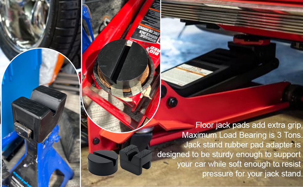 • Quality Material: Made of heavy duty construction and durable rubber material, Maximum Load Bearing is 3 Tons.Jack stand rubber pad adapter is designed to be sturdy enough to support your car while soft enough to resist pressure for your jack stand.