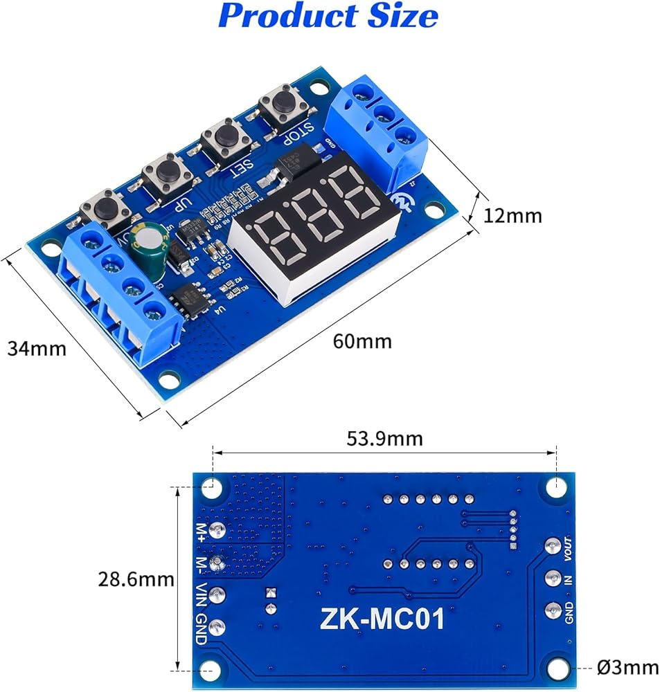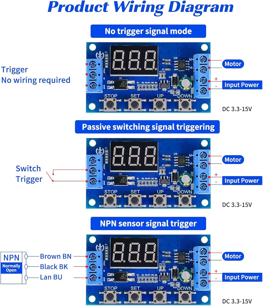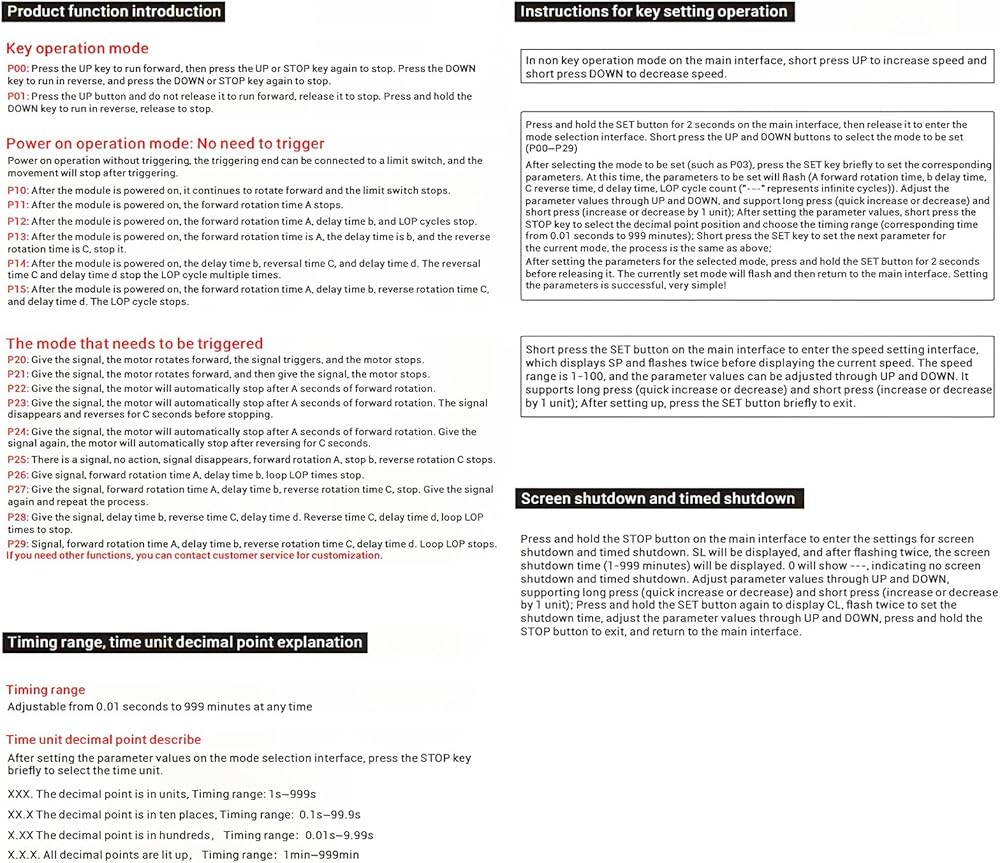Press and hold the SET button for 2 seconds and release it on the main interface to enter the mode selection interface. Press the UP and DOWN buttons to select the mode to be set (P00~P29). After selecting the mode to be set (for example, P03), press the SET button to set the corresponding parameters. The parameters to be set will flash (A forward time, b delay time, C reverse time) d delay time, LOP cycle times (""---"" represents infinite cycles). Use UP and DOWN to adjust the parameter value. Long press (quick increase or decrease) and short press (increase or decrease 1 unit) are supported. After setting the parameter value, press the STOP button to select the decimal point position and the timing range (the corresponding time is 0.01 seconds to 999 minutes). Press the SET button to set the next parameter of the current mode. The process is the same as above. After setting the parameters of the selected mode, press and hold the SET button for 2 seconds and release it. The currently set mode will flash, and then return to the main interface. The parameter setting is successful. It is very simple!