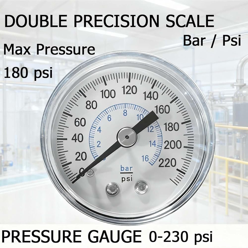 [Pressure Range] Operating pressure:0-180 PSI. MAX working pressure 230 PSI (PSI dial)