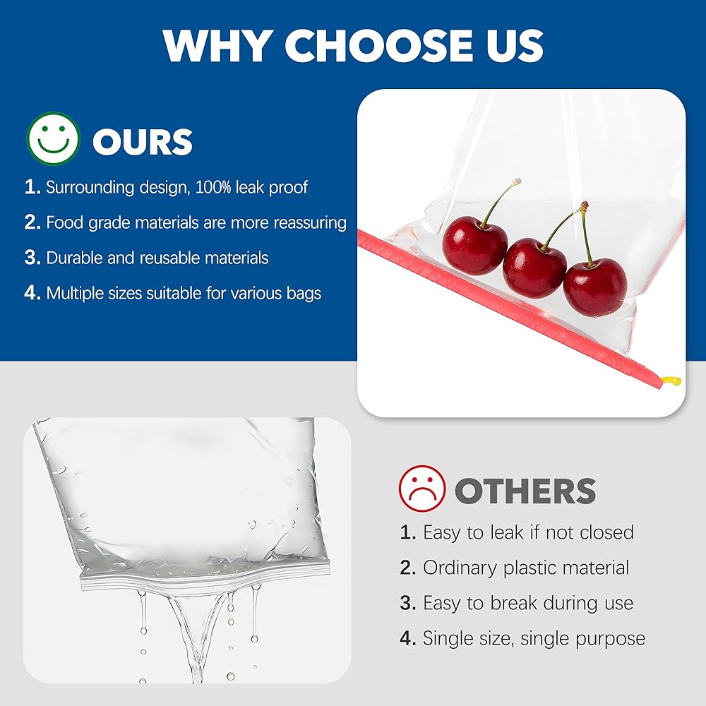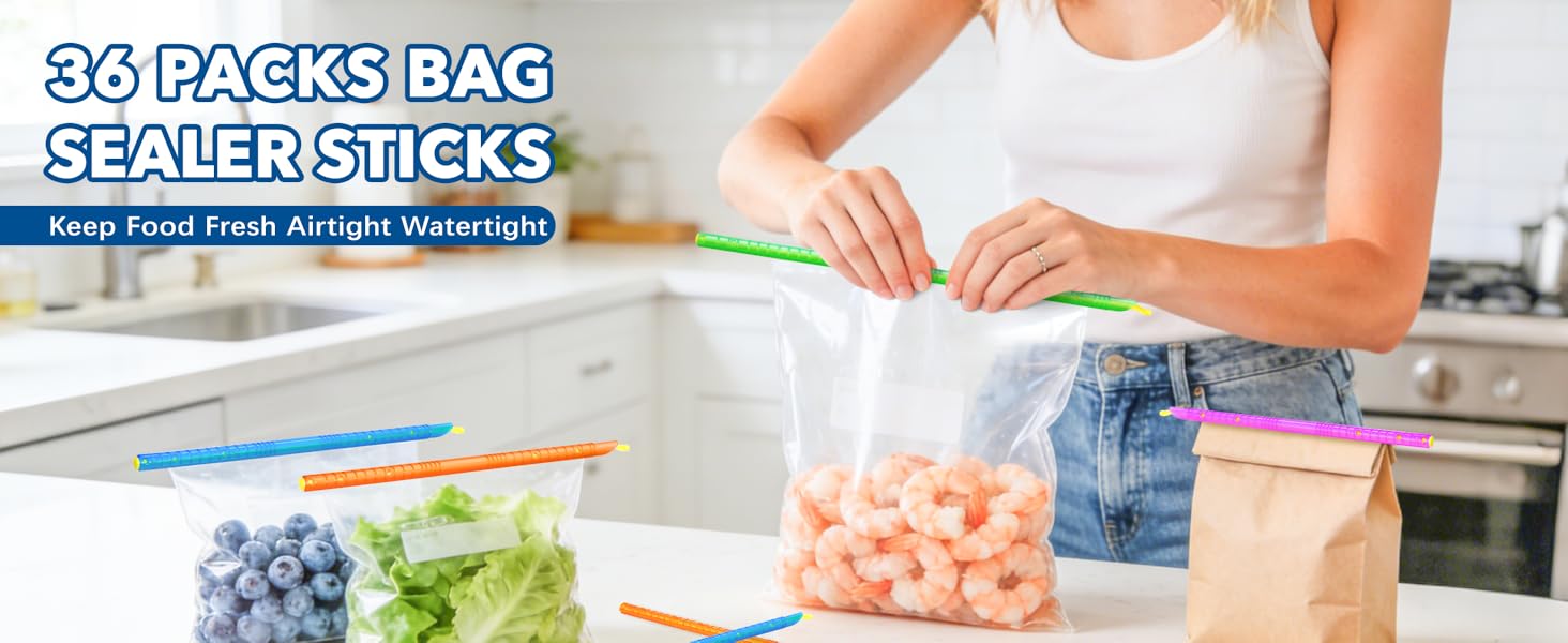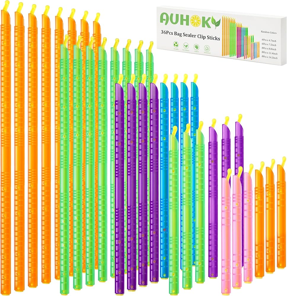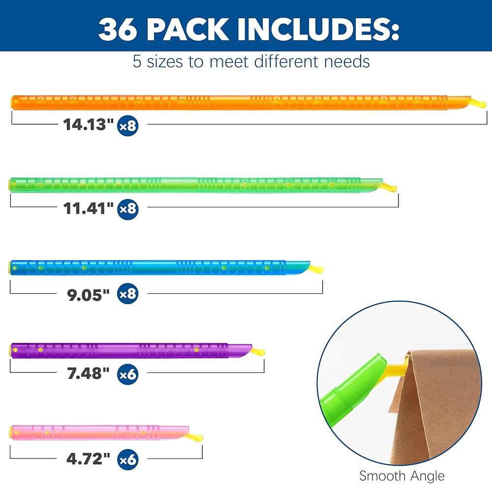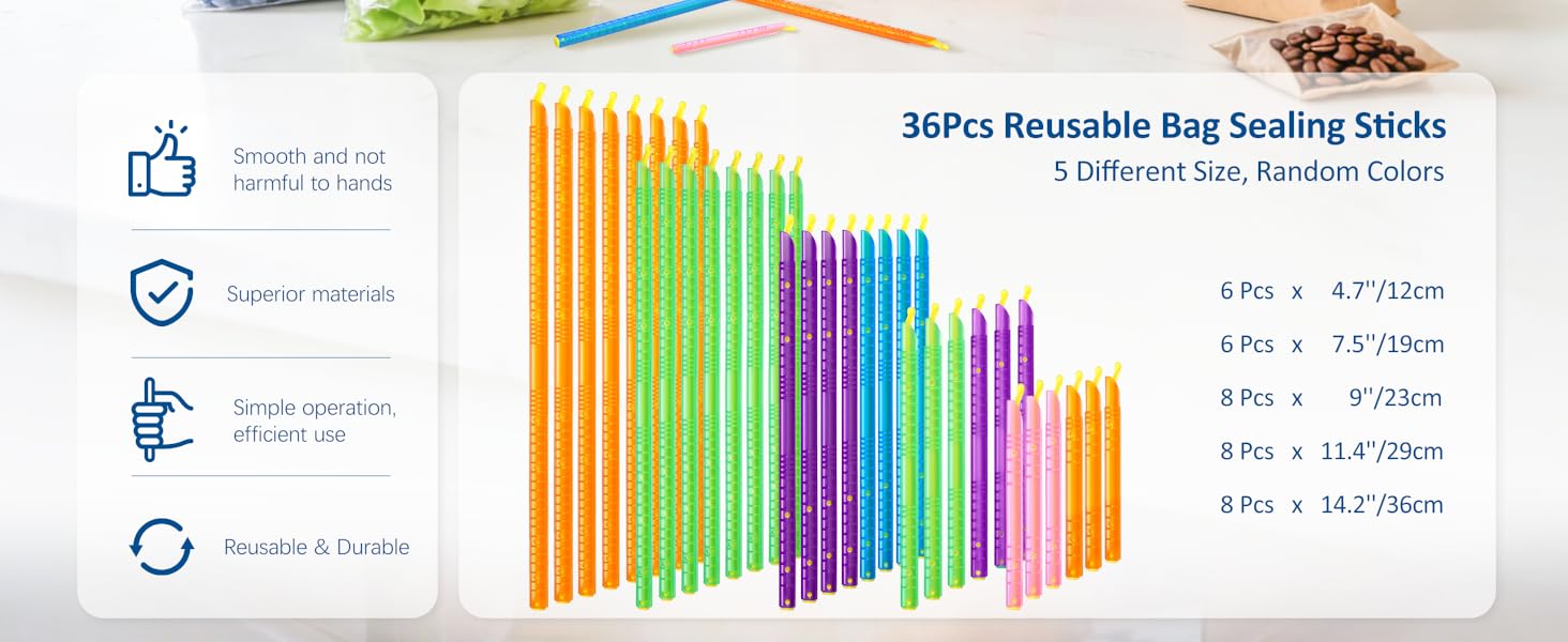 Package Content: 6Pcs x 4.7''(12cm), 6Pcs x 7.5''(19cm), 8Pcs x 9''(23cm), 8Pcs x 11.4''(29cm), 8Pcs x 14.2''(36cm), 36Pcs bag sealing sticks in total, which makes the bag sealer clips suitable for most food bags and you can storage more food, meeting all your different sealing needs