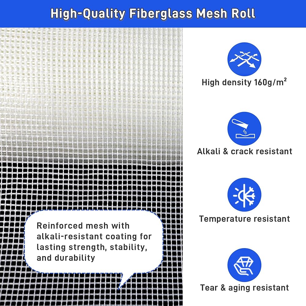 【Versatile Applications】This alkali-resistant fiberglass mesh provides reliable reinforcement for various materials including concrete, plaster, stucco, drywall, and tiles. It strengthens walls and ceilings, effectively repairing cracks, supporting interior and exterior insulation systems, and enhancing structural stability. Suitable for renovations, maintenance, or professional construction, it delivers long-lasting performance across diverse indoor and outdoor projects.