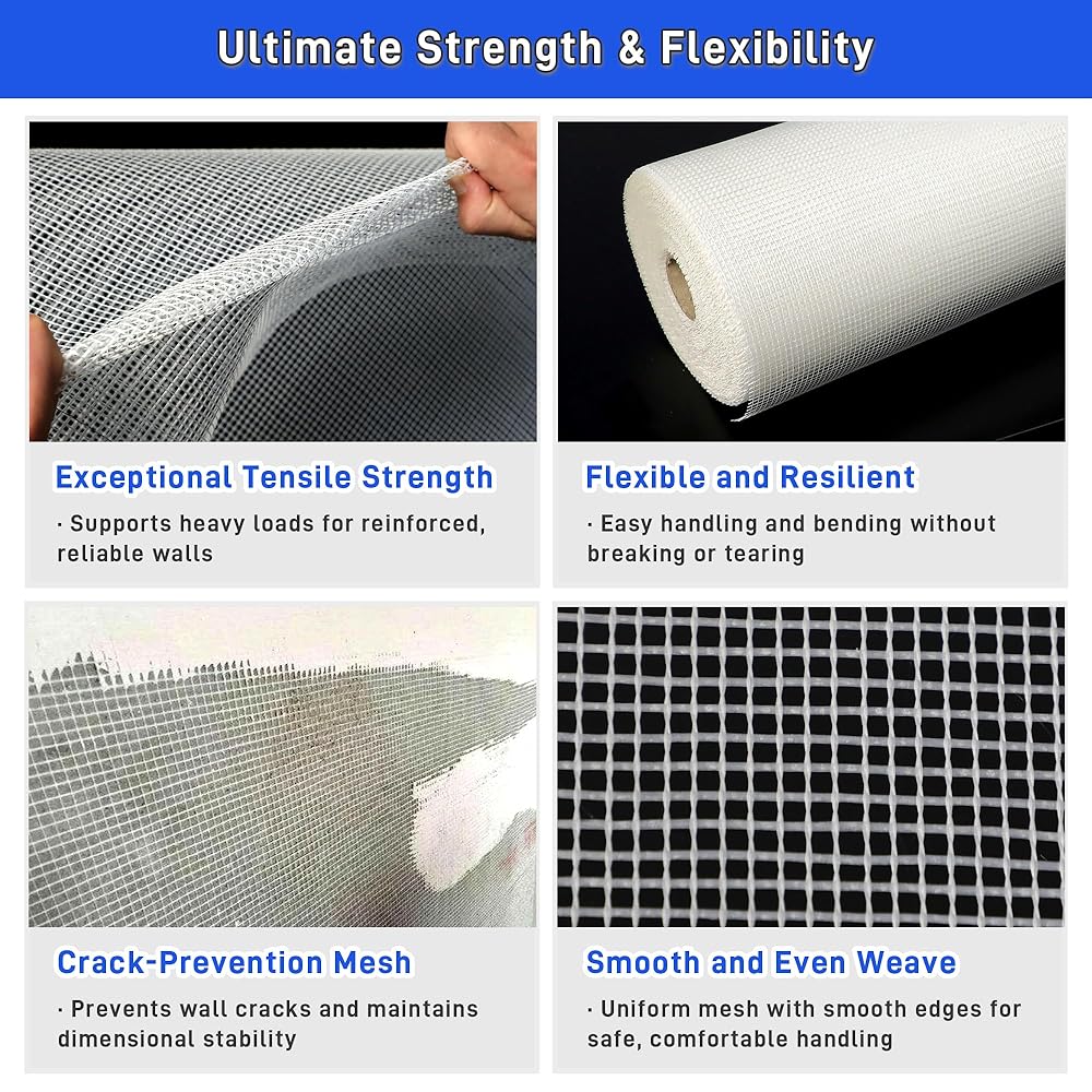 【Premium Fiberglass Material】Made from high-strength fiberglass woven fabric with an eco-friendly polymer coating, this non-adhesive plaster mesh offers excellent flexibility, tear and tensile resistance, and easy cutting. Its superior material ensures smooth application, protects surfaces from cracking, reinforces wall strength, and allows faster, more reliable installation for professional and DIY projects.