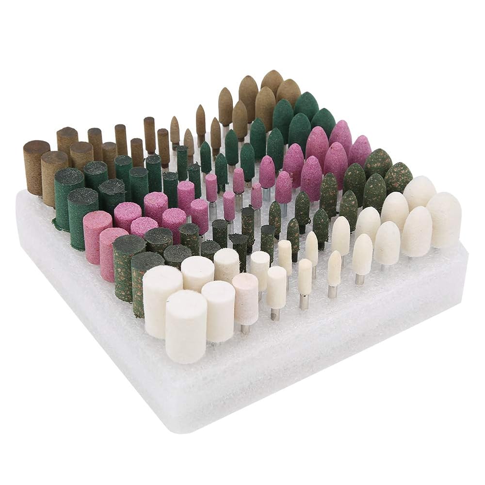 Versatile Accessories Set : This 100-piece set of grinding heads offers a wide range of options for sanding, polishing, and grinding tasks. set includes grinding wheels, green rubber wheels, white wool wheels, brown fake leather wheels, and black and green sesame wheels, making it suitable for various applications.