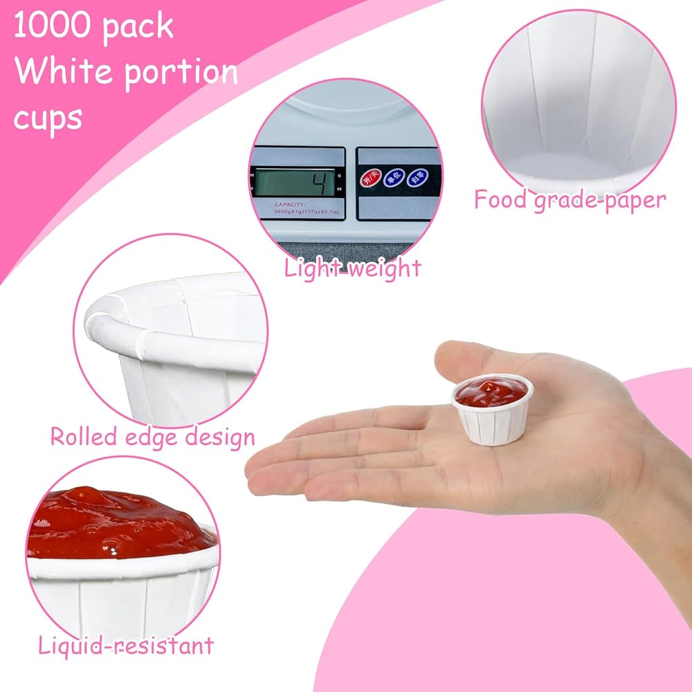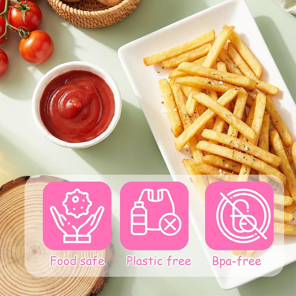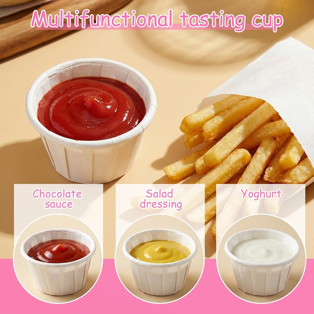 Safe Material: Crafted from food-grade paper, our disposable paper cups are safe and eco-friendly. The paper sample cups feature a waterproof lining that prevents leaks, ensuring your sauces and condiments stay contained. These paper portion cups are durable and reliable, making them a great choice for any occasion.