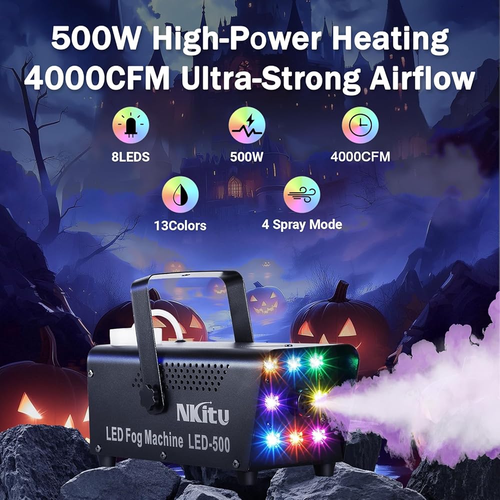 【4000 CFM High-Output Fog Machine with Wireless Remote】 This 500W professional fog machine delivers dense atmospheric haze at up to 4000 CFM, perfect for creating dramatic effects. The included remote allows control from up to 10 meters away, making it an ideal smoke machine fog solution for Halloween parties, stage performances, and photography sessions.
