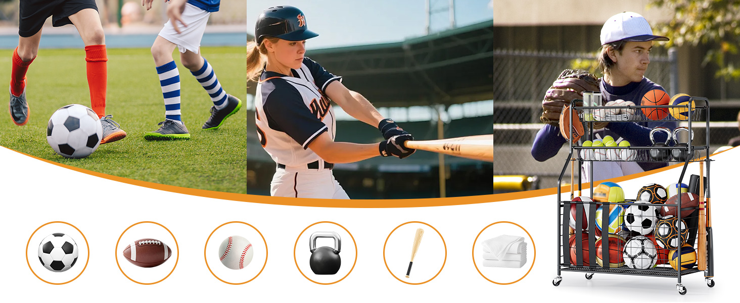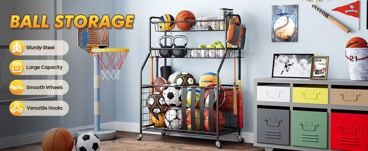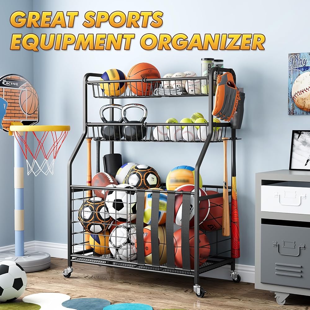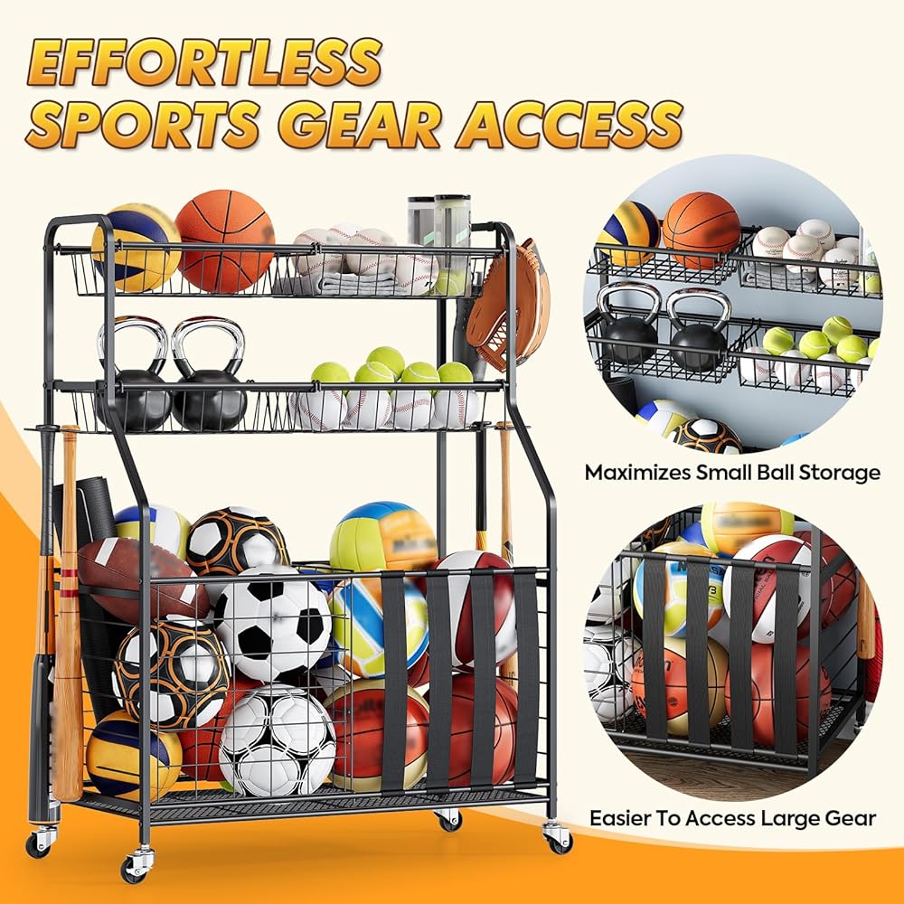 Space-Saving Garage Organization Solution: Maximize your garage storage space with this compact yet high-capacity sports equipment organizer. Ideal for garages, playrooms, gyms, schools, or outdoor areas, it helps reduce clutter while keeping all your sports gear neatly organized and within reach