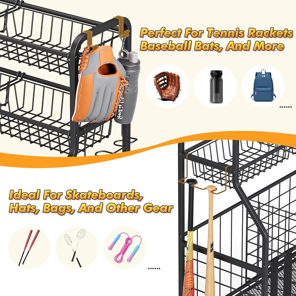Multi-Functional Garage Sports Organizer: Designed for versatile storage, this garage sports equipment organizer includes removable baskets and convenient side hooks for helmets, gloves, rackets, bags, and workout gear. It also works perfectly as a toy organizer or outdoor toy storage, keeping kids' toys and sports accessories neatly arranged