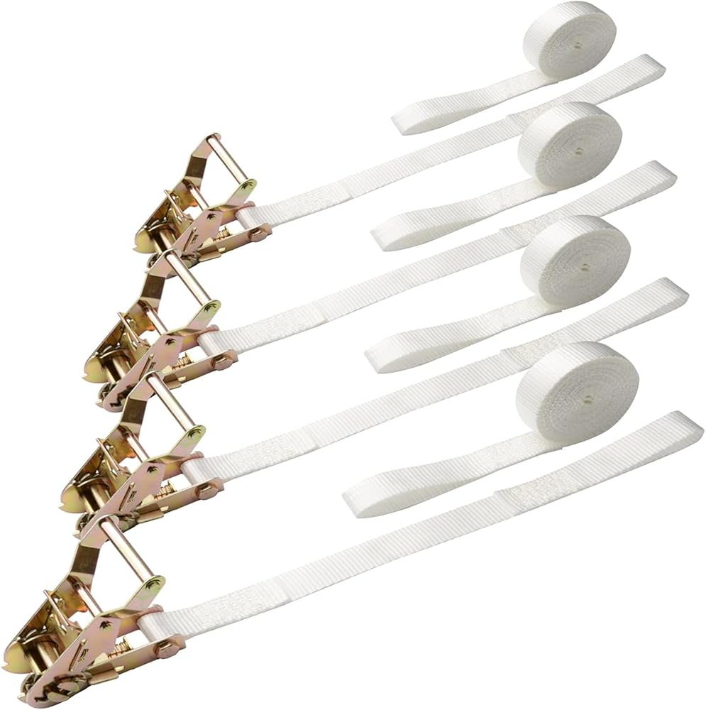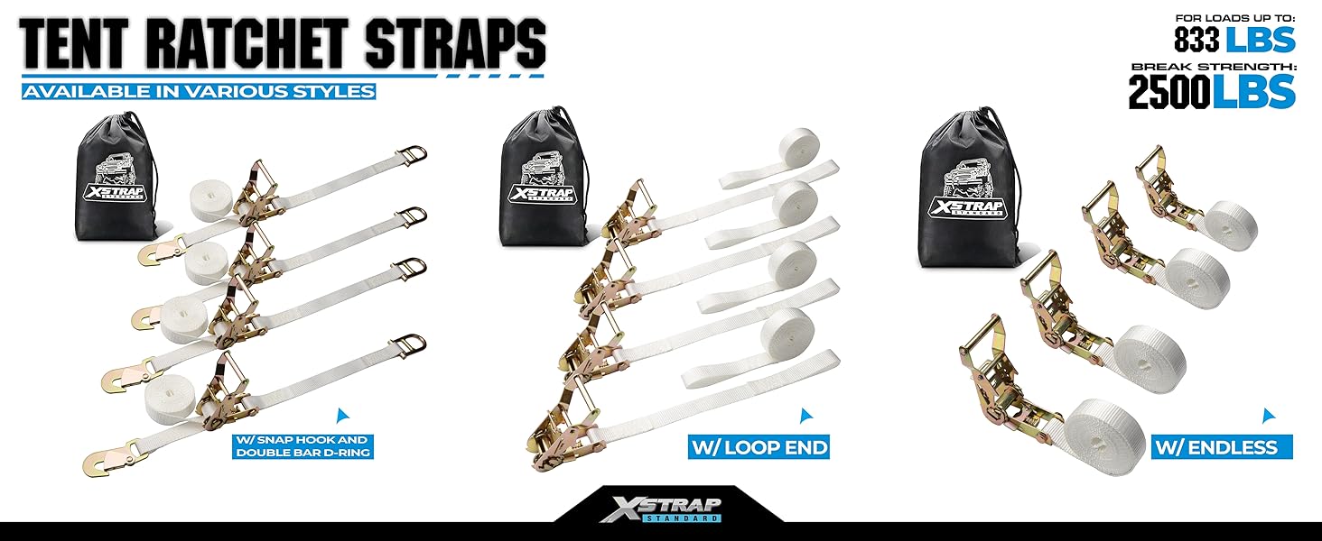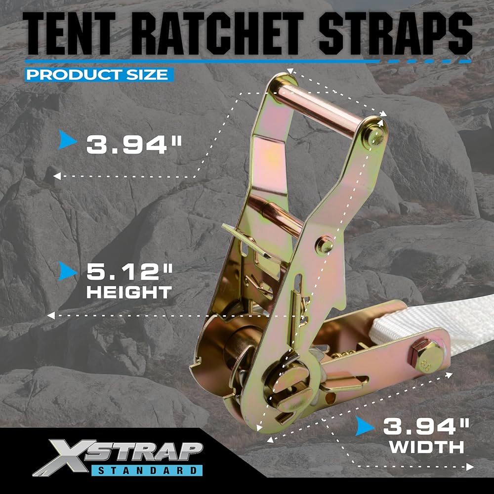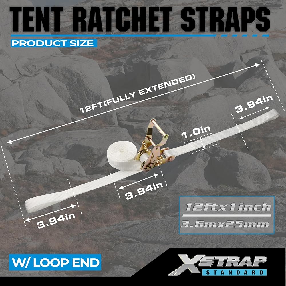 XSTRAP Standard 4PK 1" Ratchet Tent Straps with Loop End - Heavy Duty 2500lbs Breaking Strength, Secure Tents & Canopies for Camping/Events, 12ft Tie Down Straps, Durable Polyester Webbing
