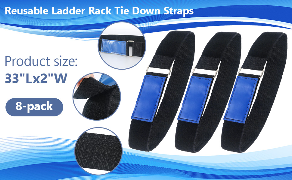 【Ladder Rack Tie Down Straps】 This 33-inch long and 2-inch wide strap is designed to fit most ladders on the market. And equipped with super strong hooks and velcro, it's very fit for fixing the ladder on the bracket.