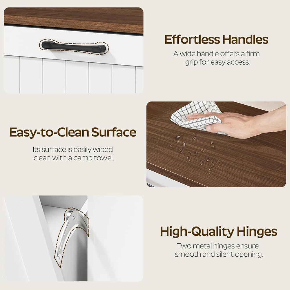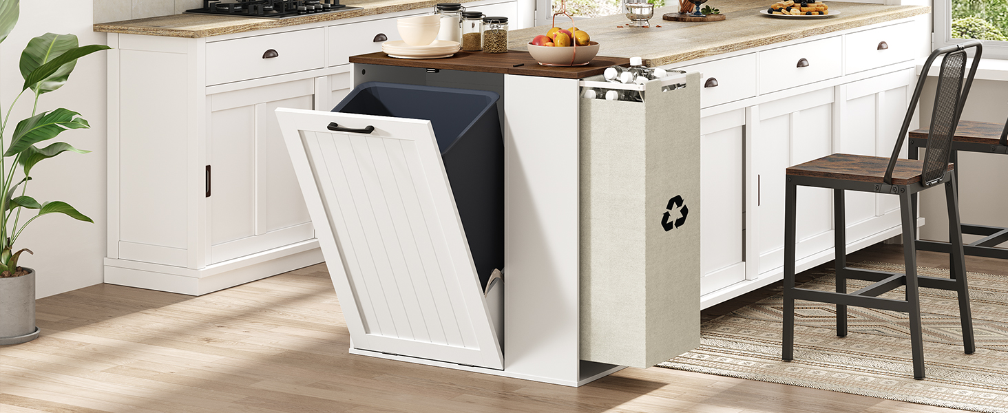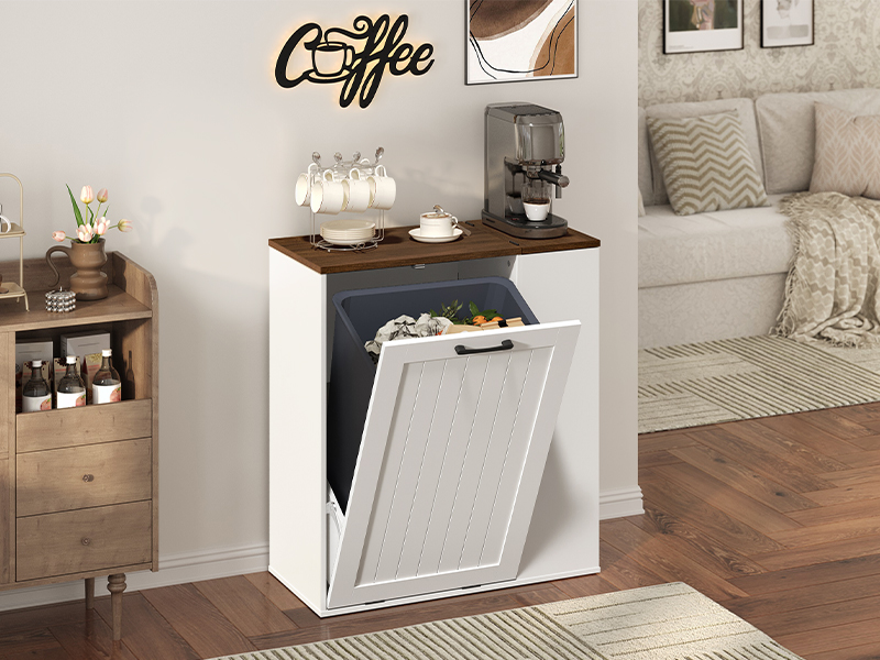 Hidden Storage for a Clean Look: With a concealment design, the trash cabinet stays completely hidden behind the door, keeping your space tidy. Its flat countertop can hold items like a coffee maker or plants, eliminating the clutter of a traditional exposed trash can
