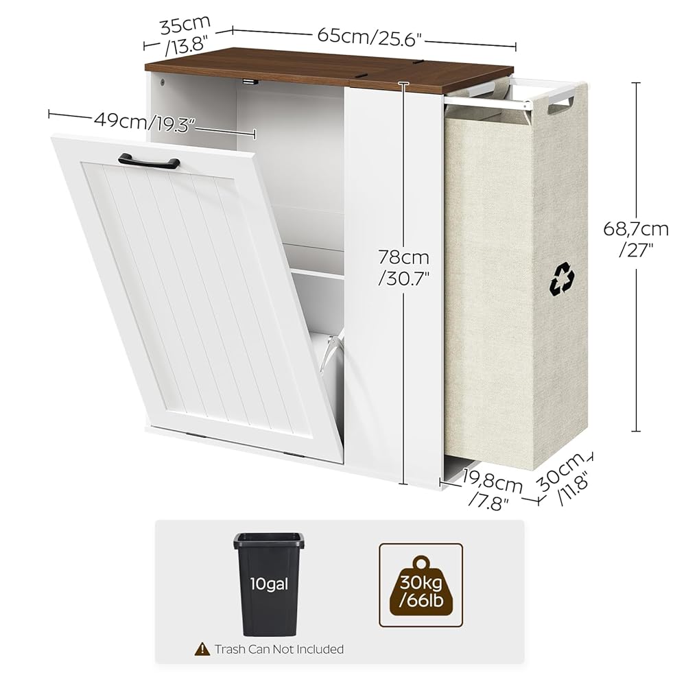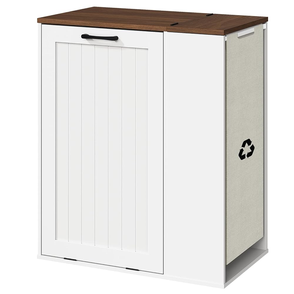 Sturdy & Easy to Clean: Crafted from high-quality particleboard, the hidden trash can cabinet offers lasting sturdiness. The side recycling area includes a robust Oxford fabric liner that resists wear. Daily cleanup is simple - wipe with a damp towel