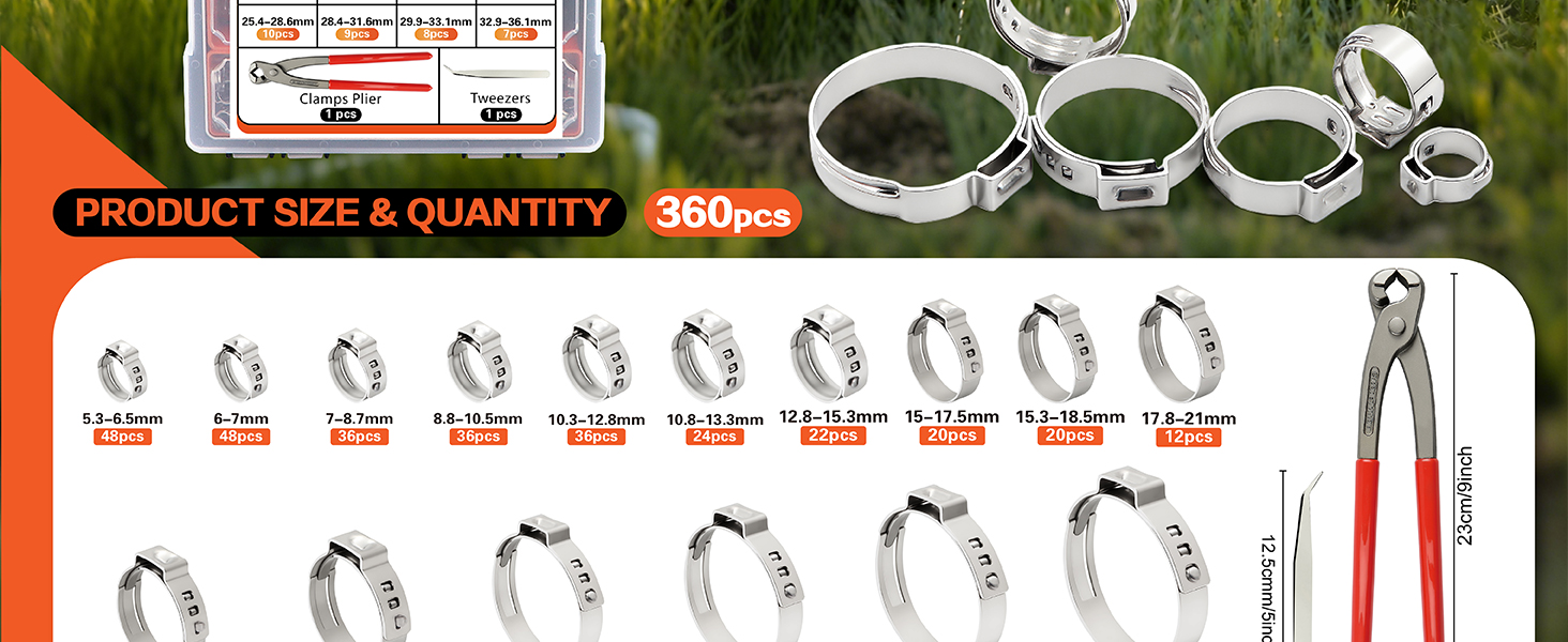 Package include:Our product is a comprehensive single-ear clamp kit featuring 360PCS across 16 different sizes,designed to cover nearly all common applications.The kit also includes 1PCS tweezers and 1PCS clamp pliers,allowing you to easily install clamps even in tight,hard-to-reach spaces