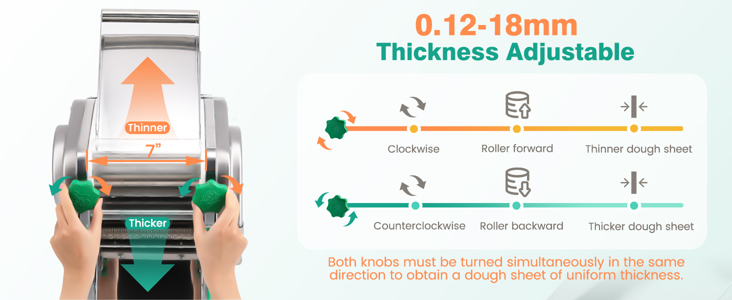 [0.12-18MM THICKNESS ADJUSTABLE] This pasta maker makes consistent thickness in your pasta sheets with stable usage. With adjustable thickness settings, you can customize the thickness of your pasta to meet your specific culinary needs. Whether you're making dumpling wrappers, dough sheets or any other pasta creation, our products offer the versatility and accuracy to make great pasta.