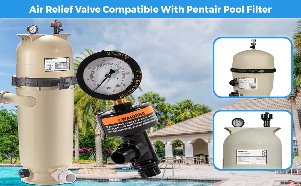 • Installation: Simply remove the old Pentair 98209800 pool filter pressure gauge and filter air relief valve and thread the new pool valve assembly onto the unit.