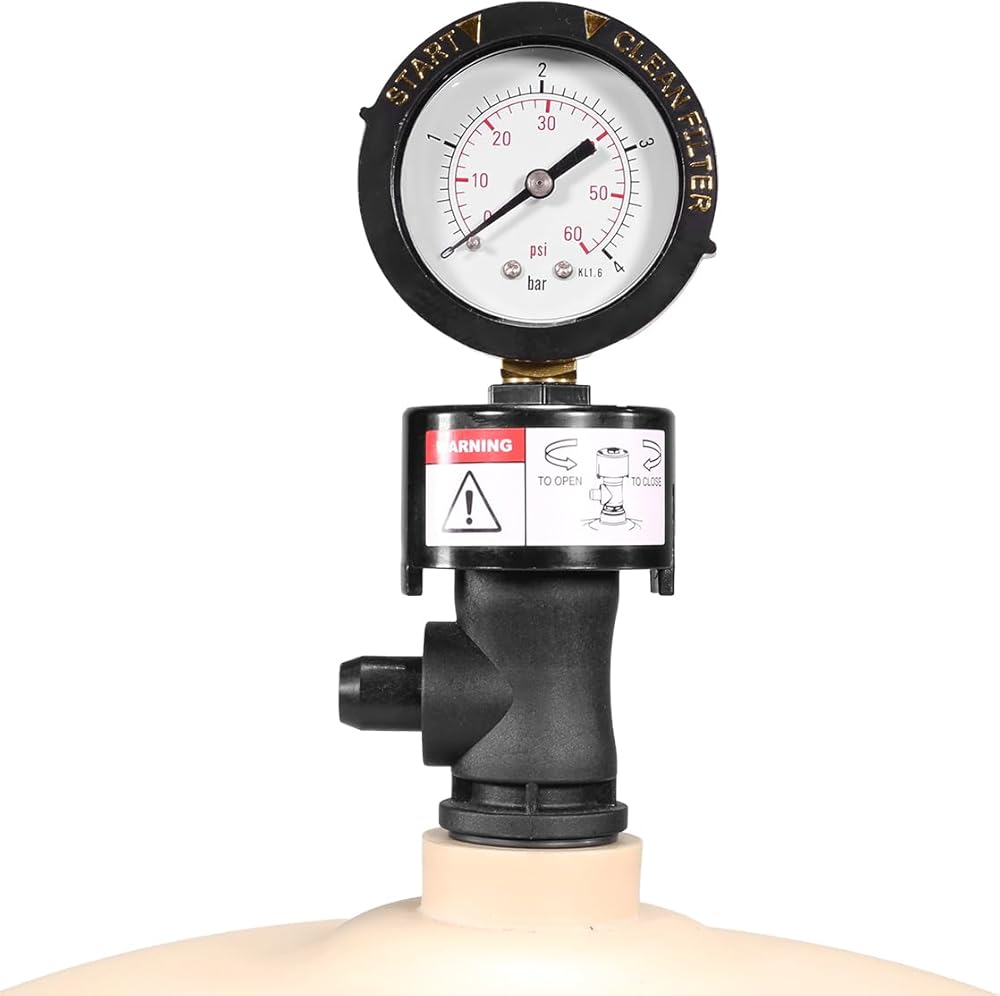 Designed to help release air from the filter and test the pressure of the filter. Easy to replace and use. Remove the broken one; Put the o-ring on the valve tail, remove the top plug; Wrap the gauge thread with telflon tape, and screw the gauge onto the top of the relief valve Features: High flow manual relief valve is very easy to install & screw to the filter. No needs for any actual tools. Simply screw the gauge plug with some telfon tape & put the rubber O-ring onto the threaded section of the tail end & insert the valve with some telfon tape right in the place of the filter to avoid leaking Turn the air relief valve on until you hear the air within the filter being released. Turn the valve back to its original position once the air and water sprays out. The Relief Valve will make sure no air is in filter Made of sturdy & solid plastic material, our High-Flow Manual Relief Valve is very sturdy for you to use for a longtime. There are also two non-slip rubber o-rings insider the valve to keep the valve have a more stable performance High Flow Manual Relief Valve is compatible with XtremepowerUS, Warrior, FNS, SMBW 2000 series and 4000, Clean and Clear, Quad DE 60, 80 & 100, & All-Predator Filters Specifications: Type: Replacement Air Relief Valve Compatible Model: XtremepowerUS DE 75202, 75221 & 75222, 75205 & 75206, Warrior, FNS, SMBW 2000 series and 4000, Clean and Clear (CCP100, CCP320, CCP420, CCP520), Quad DE 60, 80 & 100, & All-Predator filters, 188592, 188593, 188594, 160316, 160317, 160318, 160301, 160332, 011555, 147411, 180007, 180008, 180009 Package Include: Relief Valve Pressure Gauge Gauge Plug O-ring Telfon Tape Manual