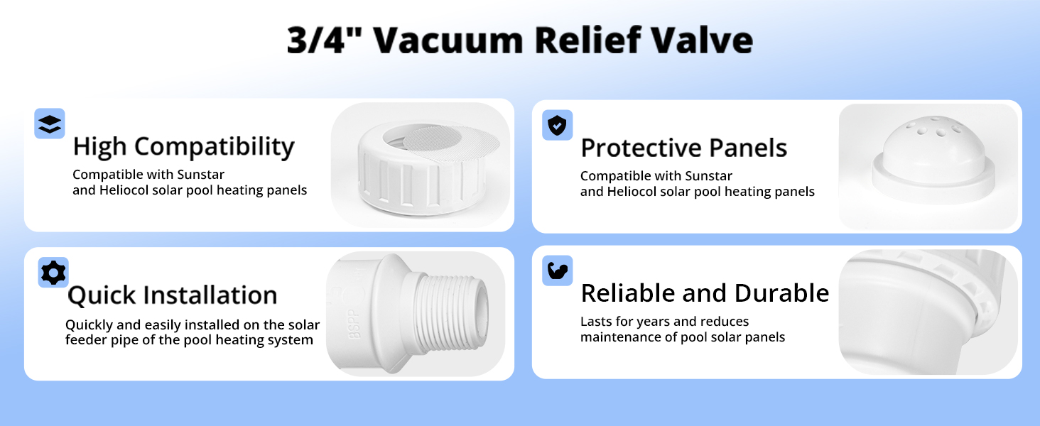 PROTECT THE PANELS: The 3/4-inch leakage vacuum relief valve prevents winter freeze damage by gravity draining the panels and pipes. It also depressurises the system when the pump is switched off, preventing the solar panels from deforming due to vacuum pressure.