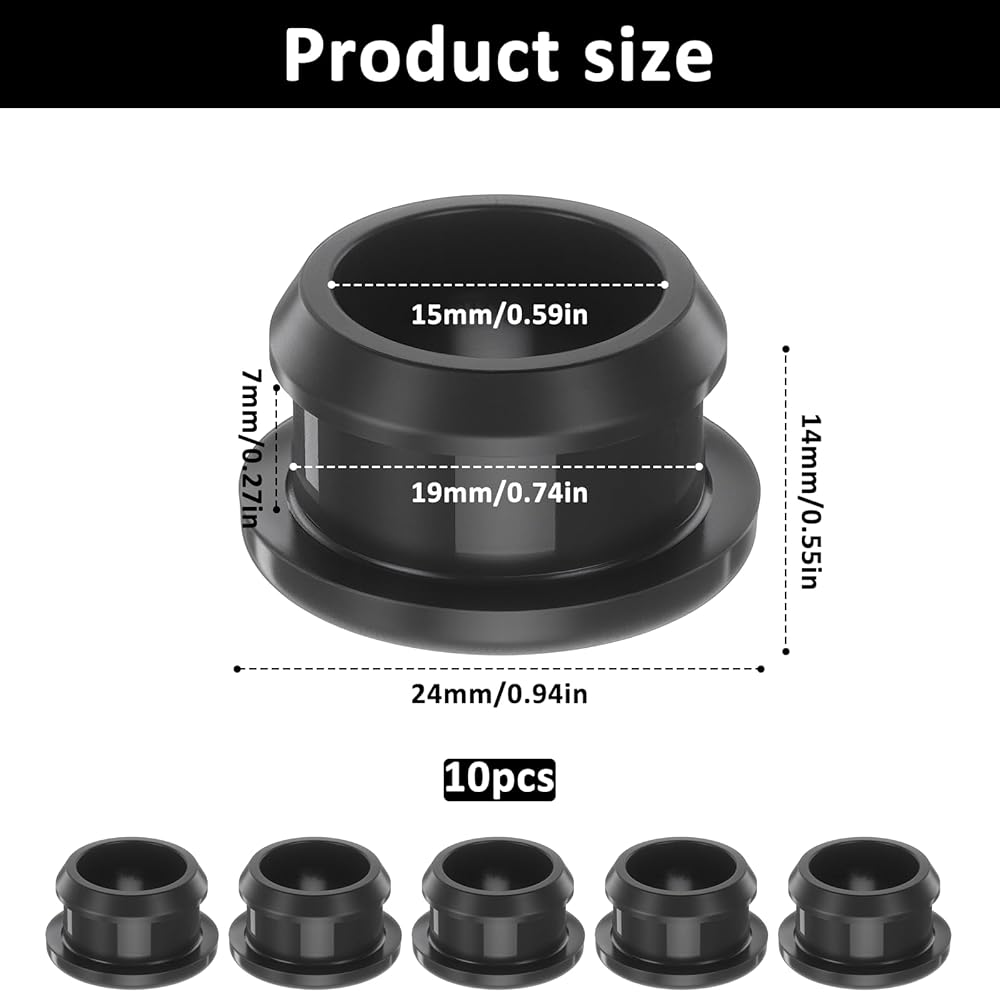SIZE:This 10-piece rubber plug with 0.75" (19mm) drill hole, 0.6" (15mm) inner diameter, 0.94" (24mm) outer diameter, and 0.27" (7mm) groove depth. Nice for various sealing and protection applications