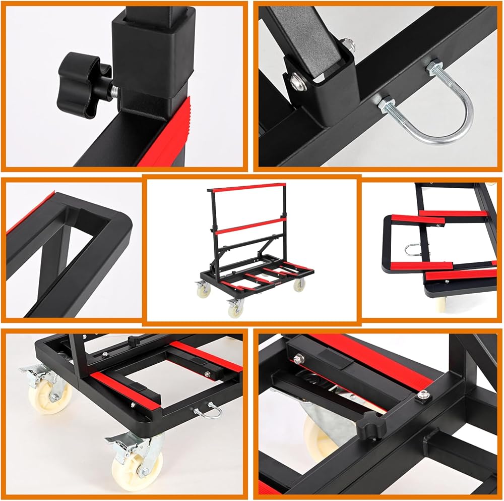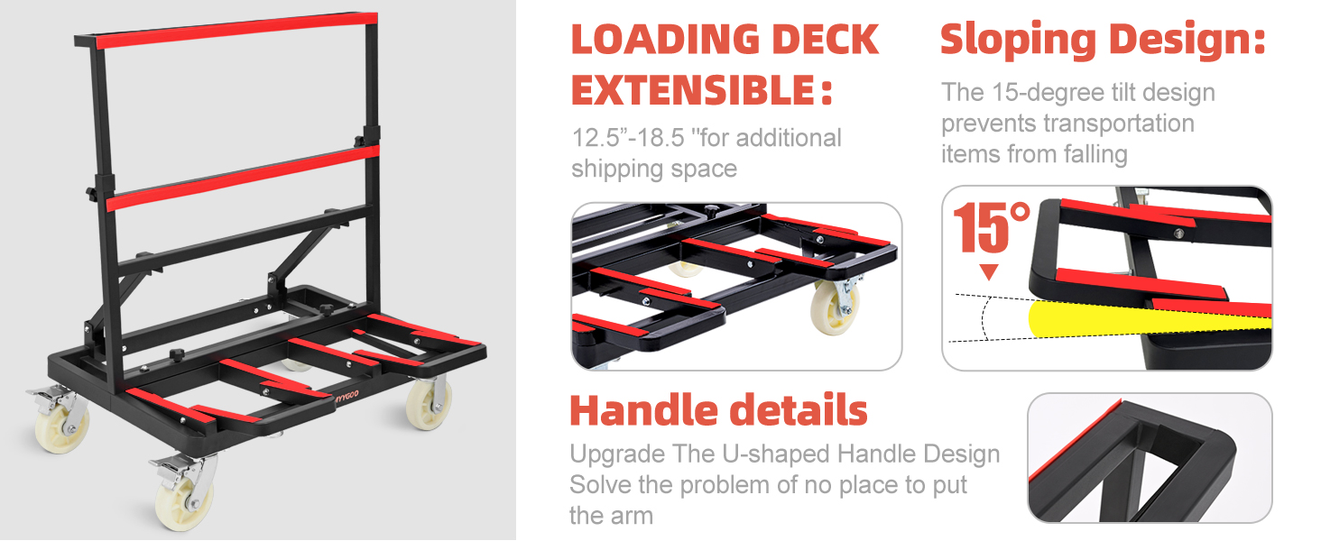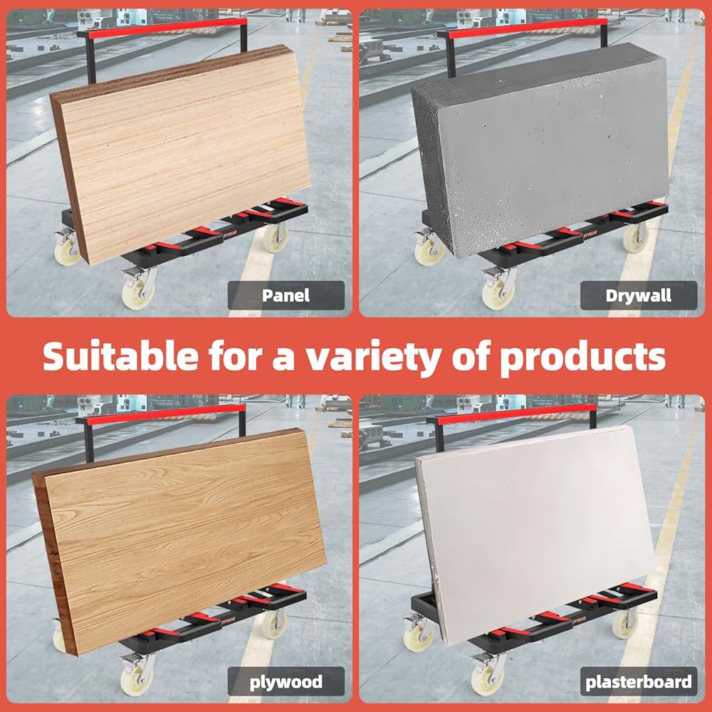 【Slope desing & Rubber Strip】 LMYYGOO panel cart dolly loading deck adopts a sloping design, it's able to keep the drywall from falling off. Our plywood cars come with an adjustable 2 meter ratchet strap, when you are carrying some long drywall, you can tie them to the handrail with a rope to keep them stationary, keep drywall safe