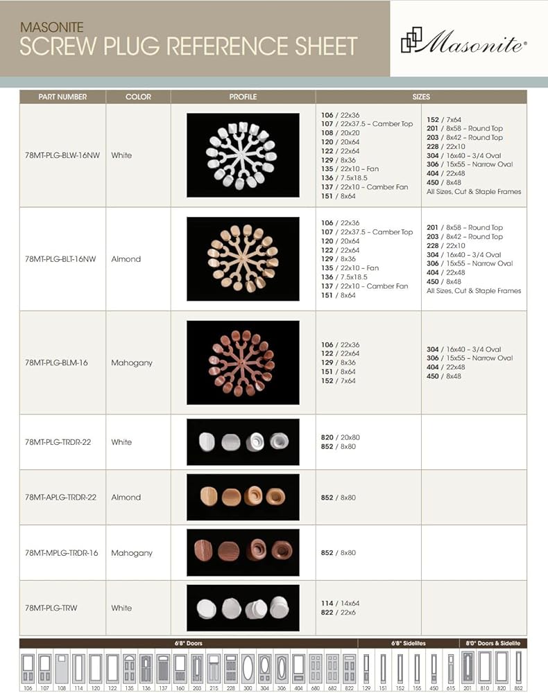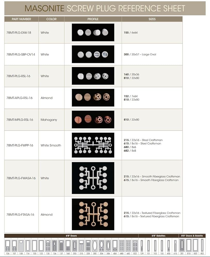 Comes in white. Plugs are paintable. Fits into Masonite Door Frames. Comes with Four Corner plugs and Twelve Side Plugs. 5/16" In Diameter.
