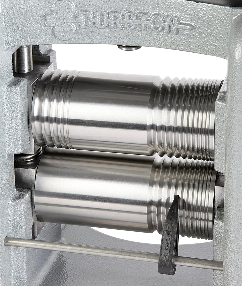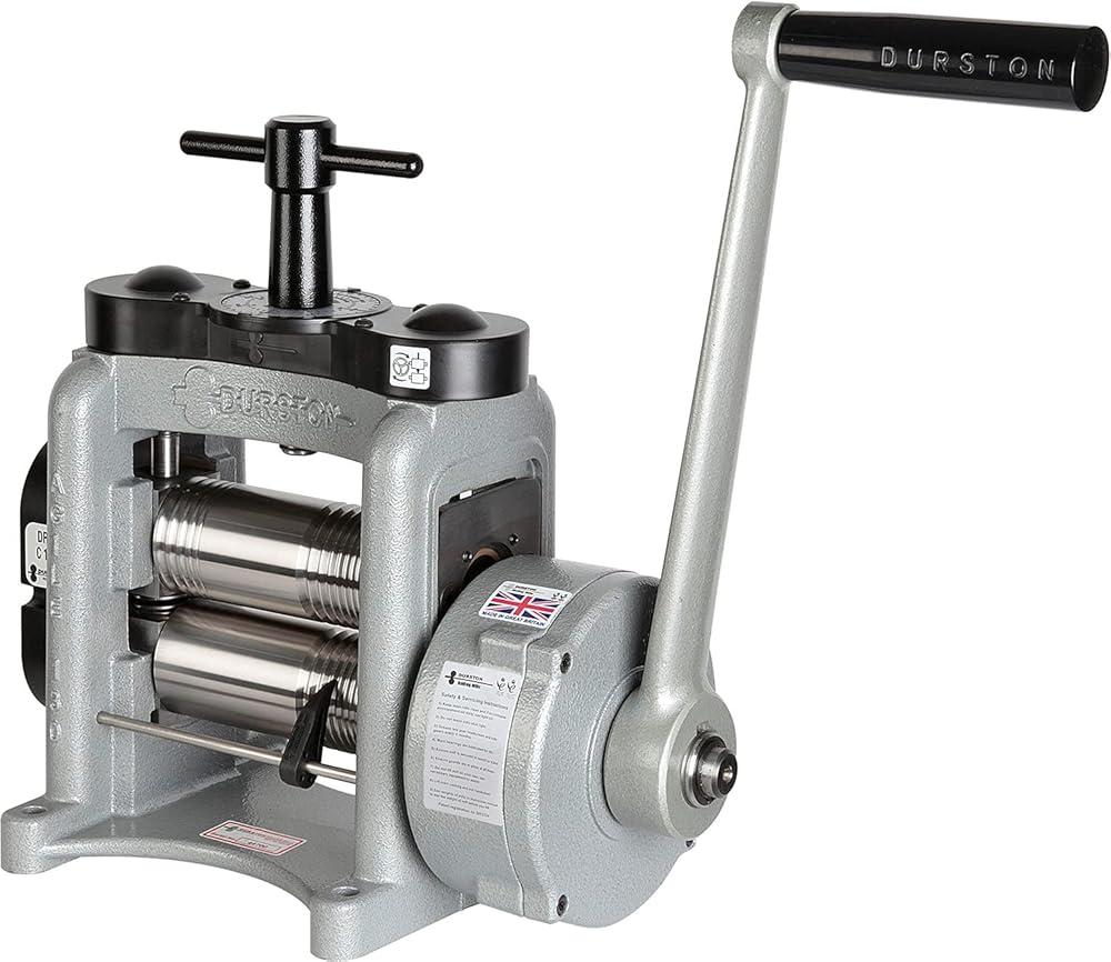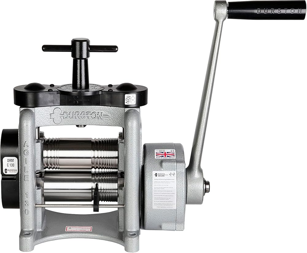 Durston Agile 130mm Combination Rolling Mill - C130 Built with Durston's award-winning design and engineering expertise, the Durston Agile C130 rolling mill easily rolls sheet, square wire, and half-round wire to the precise gauge you need for your metal-forming work. Versatile Rolling This combination rolling mill offers a generous flat area (60mm, 2-3/8”), eleven square grooves, and five half-round grooves. The shaped grooves are ideal for creating and drawing out square or half round wire, while the flat area gradually reduces metal thickness. You can also use pattern plates in the flat area to emboss sheet for more detailed and complex designs. Agile Design This Durston Agile C130 mill features a few small changes to the design that make this lighter-weight, more affordable mill available to every jeweler without sacrificing any operational efficiency or quality that you would expect from a Durston rolling mill. T-bar replaces the usual hand-wheel. Rollers are specially induction-hardened to 64 HRC (to a depth of 6mm on the main barrel) for a lifetime of service. Bearing blocks are fully supported for the best possible finish on your rolled metal. Bearings are self-lubricating and maintenance-free. Protective guard around top gears. Heavy-duty, 5:1 gearbox makes operating the mill much easier.