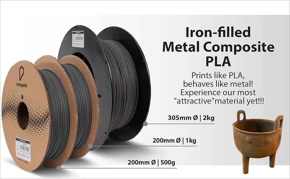 Metal Infused Filament: Protopasta Metal Filled PLA 3D Printer Filament is comprised of a base PLA plastic mixed with 45% by weight iron powder. This 500g spool of 1.75mm metallic composite filament has twice the density of standard PLA filament, making it perfect for prints requiring a metal look and feel. This iron PLA filament is also ferromagnetic, allowing magnets to stick to it.