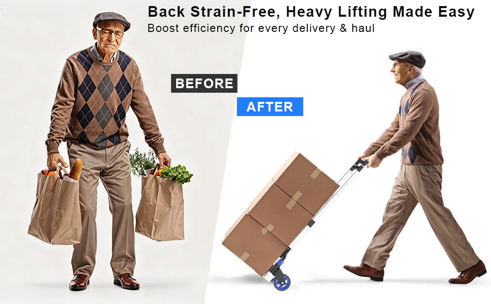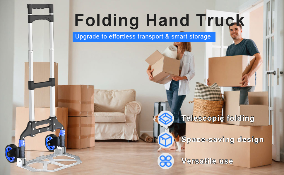 Anti-Pinch Design & Quick Folding: Featuring a safe anti-pinch handle mechanism, our hand truck foldable effectively prevents hand injuries during use and is especially ideal for transporting oversized cargo. No complicated operations are required—you can fully fold or unfold this compact folding dolly in just 3 seconds with 2 simple steps. It saves you significant time and effort for storage at the office or workplace