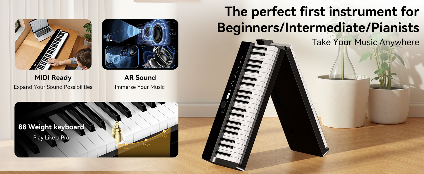 【Full Size 88 Key Weighted Action & Pro Triple Pedals】Experience the authentic feel of an acoustic piano with our full size 88 key keyboard. The weighted keys provide a responsive and realistic touch, perfect for beginner piano players to build proper technique and for adults seeking a genuine playing experience. The included sustain pedal and triple pedal board (Soft, Sostenuto, Sustain) allow for expressive piano performances.