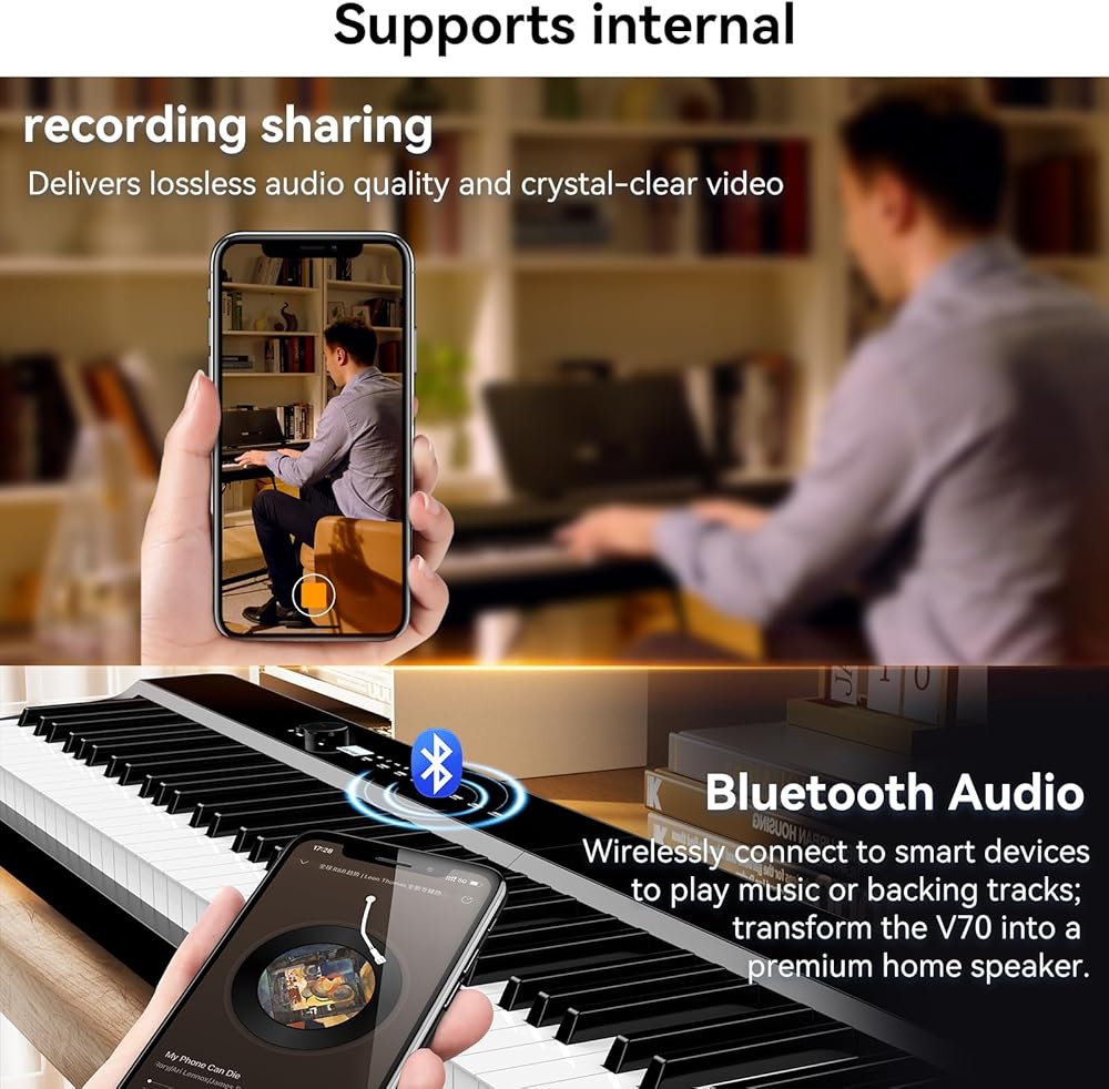 【Immersive 4 Speaker Sound System with Rich Tones】Don't settle for weak, tinny sounds. The V70 digital piano features a powerful 4 speaker audio system (Dual 20W full range + Dual 5W tweeters) that delivers crystal-clear, room-filling sound across the entire tonal range. Whether you're practicing classical pieces or exploring modern rhythms, this music keyboard ensures every note is heard with stunning clarity and depth, bringing your keyboard music to life.
