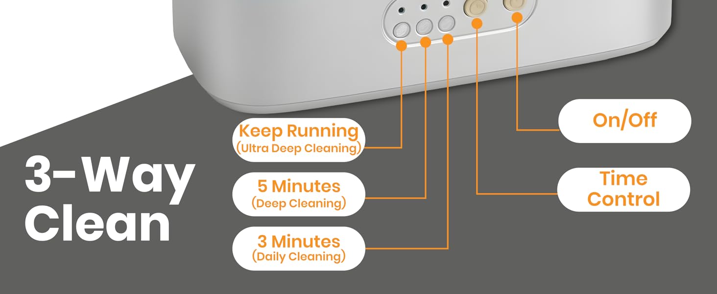 𝟑𝟔𝟎° 𝐃𝐞𝐞𝐩 𝐂𝐥𝐞𝐚𝐧𝐢𝐧𝐠 & 𝐀𝐝𝐣𝐮𝐬𝐭𝐚𝐛𝐥𝐞 𝟑-𝐒𝐩𝐞𝐞𝐝 𝐂𝐨𝐧𝐭𝐫𝐨𝐥: Enjoy 360° full cleaning powered by precision ultrasonic waves that reach every crevice. Choose from three adjustable speed levels for customized performance — gentle mode for delicate lenses, medium for jewelry, and high intensity for sturdy tools like combs or brushes.