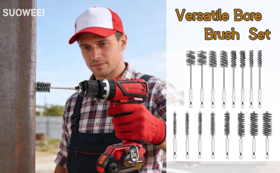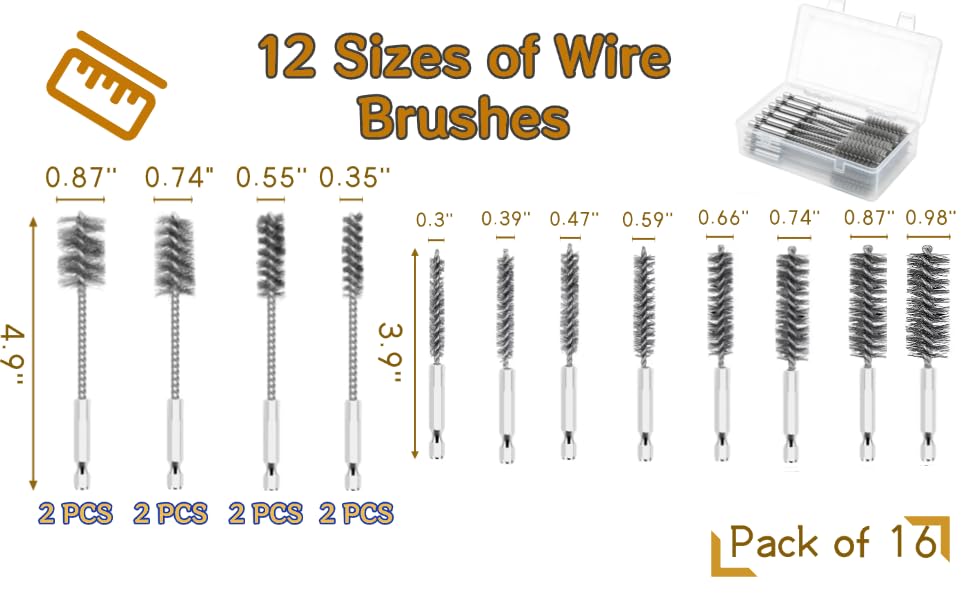 【16-Piece Set Value-Pack】This value-packed 16-piece set includes 12 essential wire brush sizes. The 4.9'' (12.5cm) length brushes come in four sizes: 3/8“ (9.9mm), 1/2” (14mm), 3/4“ (19mm), 7/8” (22mm).3.9'‘ (10cm) length with eight sizes: 5/16“ (8mm), 3/8” (10mm), 7/16“ (12mm), 9/16” (15mm), 11/16“ (17mm), 3/4” (19mm), 7/8" (22mm), 1'' (25mm). Ample quantity and diverse sizes suitable for various application needs, it can complete tasks flexibly and efficiently.