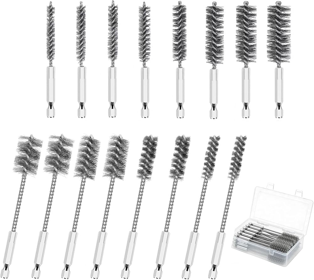 16 Pcs Stainless Steel Bore Brush Set, Heavy Duty Wire Brush for Drill with Hex Shank, Bristles Bore Cleaning Brush Set for Power Drill, Rust, Tube Cleaning