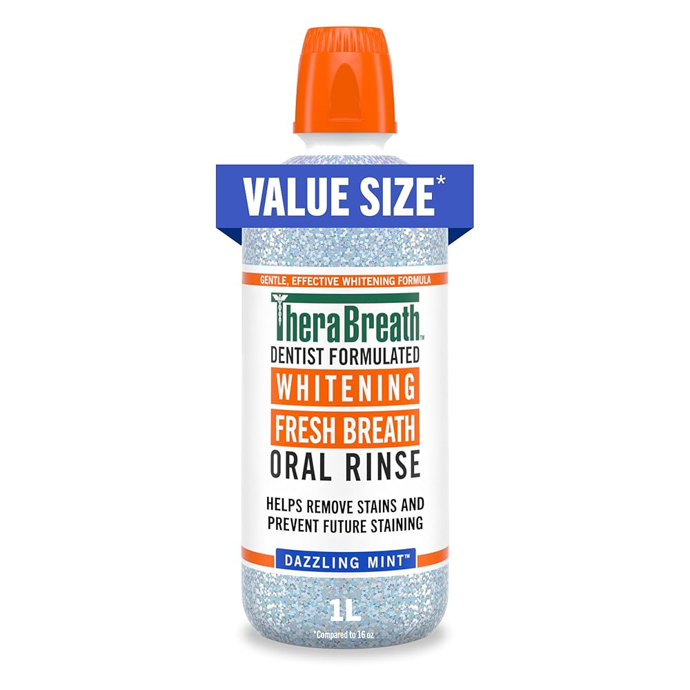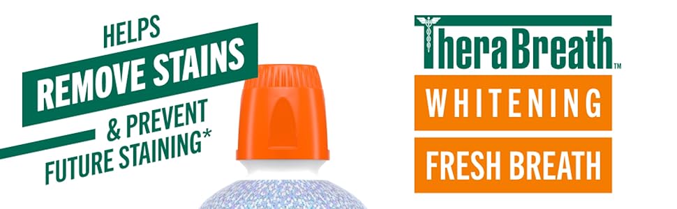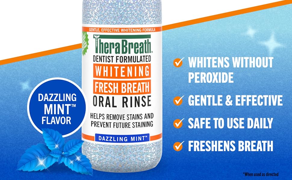 TheraBreath Whitening Mouthwash is tough on stains and bad breath but gentle on teeth. This whitening rinse helps remove stains while also forming a protective barrier that prevents future staining. Safe to use every day, TheraBreath Whitening Mouthwash is formulated without peroxide, which is commonly found in many whitening products and can lead to tooth sensitivity and discomfort. Like all TheraBreath mouthwashes, our Whitening Mouthwash is dentist-formulated with powerful breath freshening ingredients. The alcohol-free formula doesn't burn or irritate, and the Dazzling Mint flavor is gentle and refreshing. We're so confident in the effectiveness of TheraBreath Oral Rinses that we back them up with our 100% guarantee. If you're not satisfied, contact us within 30 days of purchase for a full refund.