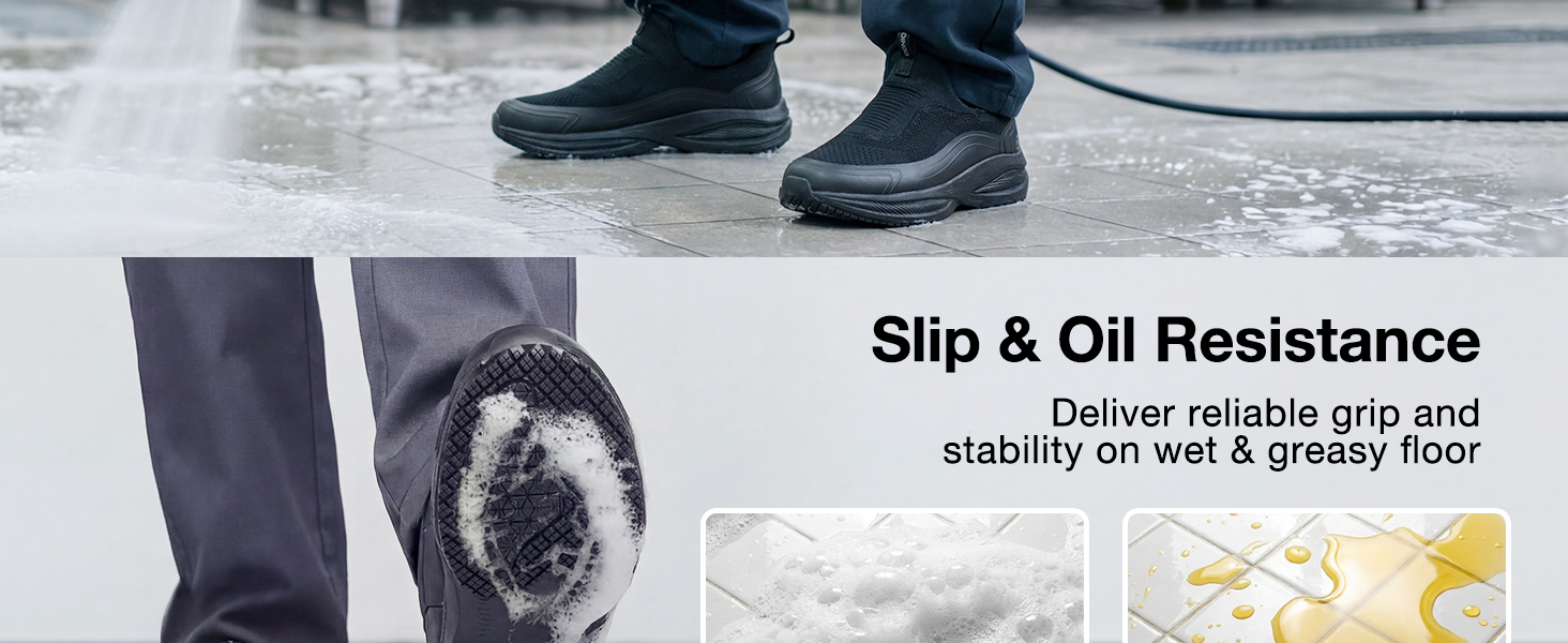 • Certified Slip Resistance: Featuring pro-grade rubber outsoles and a specialized tread pattern, these slip resistant work shoes exceed ASTM F2913-24 standards. They provide excellent grip on greasy and wet tile floors, preventing slip risks. Move with safe and secure steps for total peace of mind during your shift