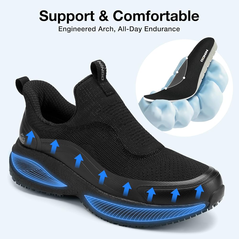 • Effortless Slip On Design: Experience the hands-free convenience of our easy slip-on design. These slip on shoes offer a secure wrap-around fit with ankle stability guards on both sides, perfect for busy workers needing a stable and flexible fit with no lace hassle from clock-in to clock-out