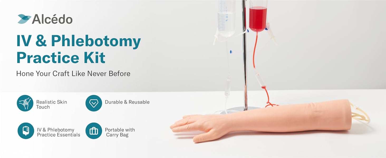 Alcedo Phlebotomy Practice Kit, Complete Venipuncture and Injection IV Practice Essentials, Realistic Training Arm with Stand & Carry Bag, Light Skin, for Medical Students & Educational Use Only