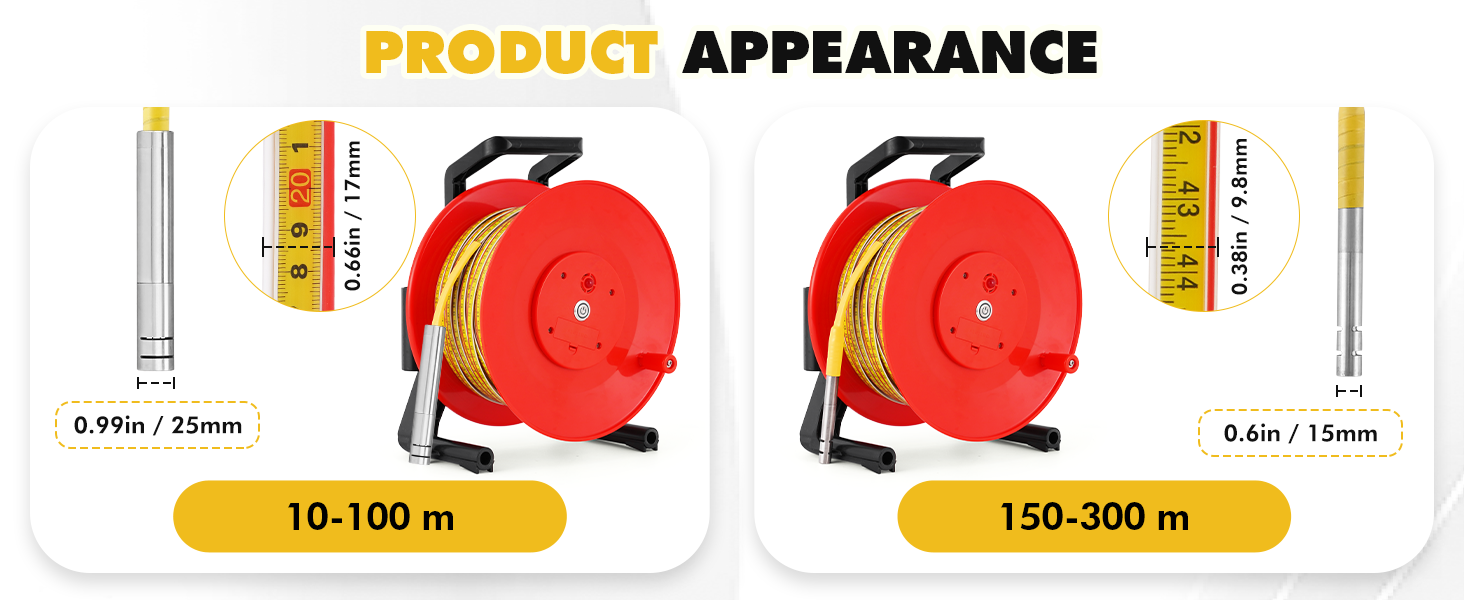 【Stainless steel probe】10-100m is a large probe with a diameter of 25mm, while 150-300m is a small probe with a diameter of 15mm; The probe should be handled gently, do not bend the steel cable, especially the part near the probe