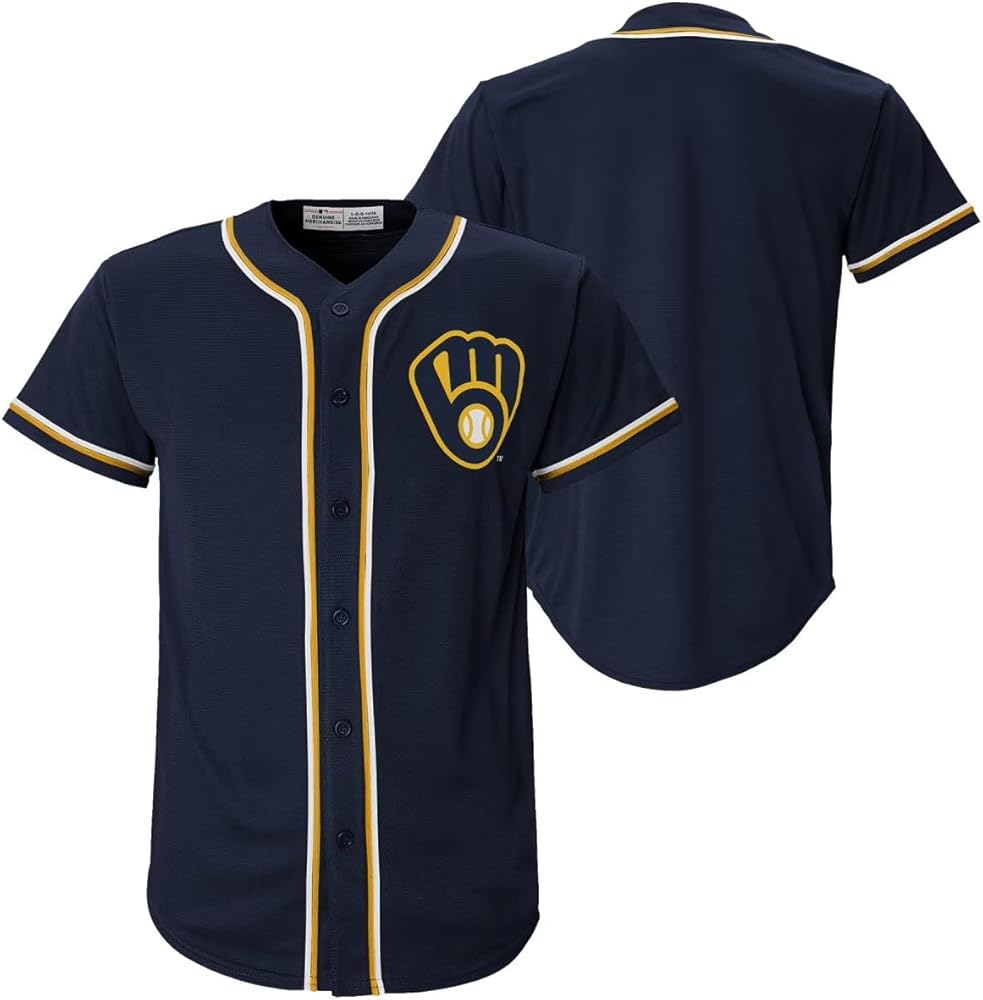 Milwaukee Brewers MLB Kids Youth 4-18 Navy Team Color Embroidered Stitched Logo Baseball Fashion Jersey - Your young fan can rep the Milwaukee Brewers in style with this Kids Navy Fashion Jersey, the perfect piece to take their love for the game from the ballpark to the backyard and everywhere in between. This officially licensed youth jersey is designed with authentic team spirit in mind, featuring the Brewers iconic primary logo beautifully Embroidered on the left chest—giving it a true big-league look that stands out on game day. Made from lightweight, breathable fabric, this kids baseball jersey keeps them comfortable and cool whether they're cheering from the stands, playing catch, or showing off their Brewers pride at school. The classic button-down front, contrast piping along the collar, placket, and sleeves, and the rounded hem add a timeless baseball vibe that looks great layeNavy or worn on its own. This fashion jersey isn't just about looks—it's made to handle the energy of young fans. It's durable enough for everyday wear yet soft enough to keep them comfortable all day long. Available in youth sizes X-Small (4/5), Small (6/7), Medium (8), Large (10/12), X-Large (14/16), and XX-Large (18) to fit kids ages 4–18, this jersey makes an awesome gift for birthdays, holidays, or special trips to the ballpark.
