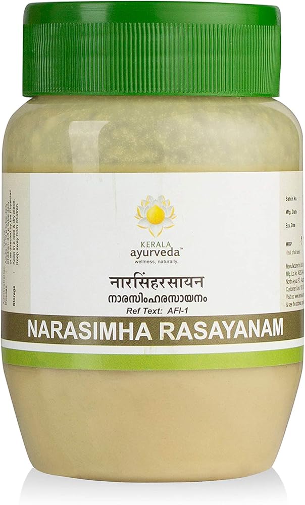 Quantity: 200 gm; Item Form: Ghritam; Narasimha Rasayanam is also known as medicated butter that helps in the treatment of physical weakness and degenerative diseases. It is beneficial in rejuvenating the body, improving immunity, and supports weight gain naturally. It helps strengthen hair follicles from the root and assists in healthy hair growth.