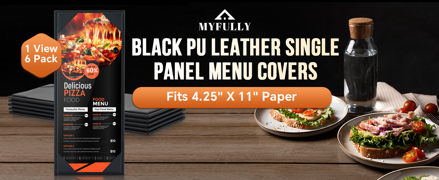 MYFULLY Restaurant Menu Holders 4.25" x 11", 6 Pack Black PU Leather Single Panel Menu Covers with Angled Corners for Restaurant, Bar, Coffee Shop, Wine List (1 View)