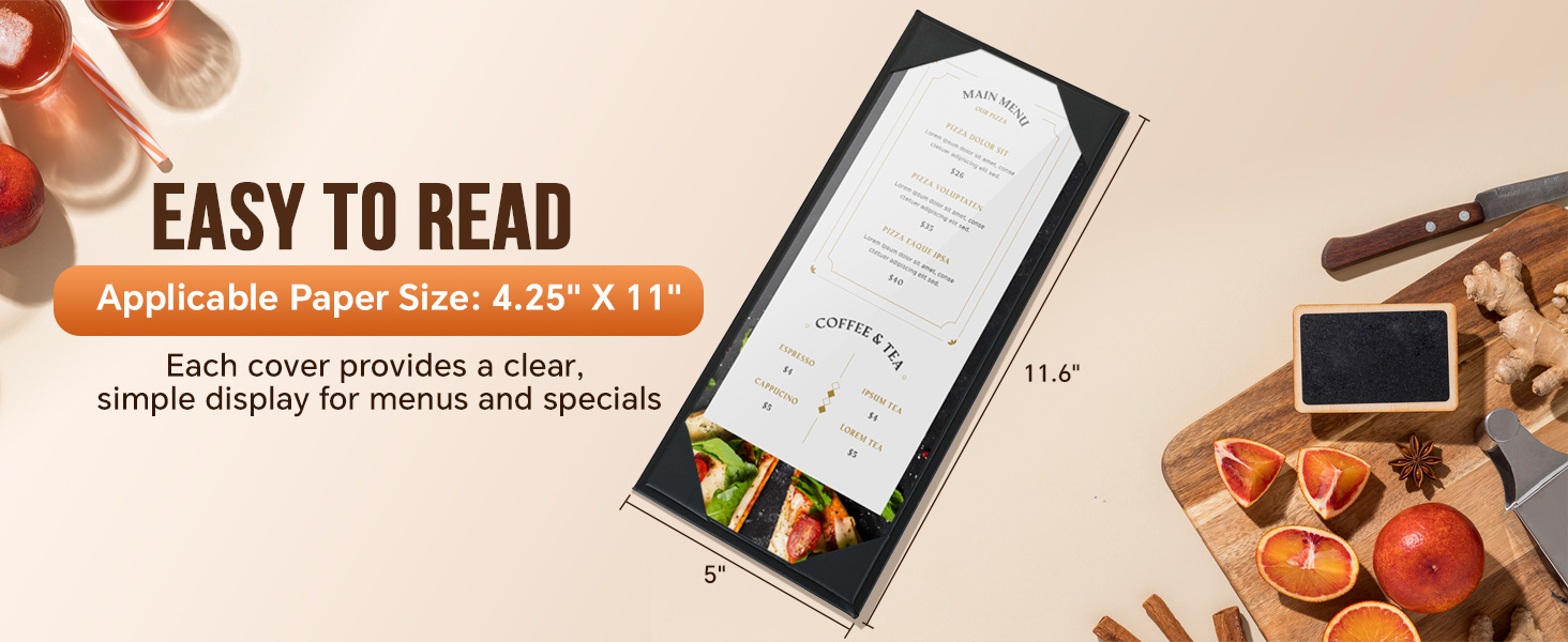 Clear Display: Menu cover size: 5" x 11.6", Applicable paper size: 4.25" X 11". Each menu cover offers a clean, uncluttered presentation for drink menus, wine lists, or daily specials. Perfect for restaurants, cafés, bars, and hotels.