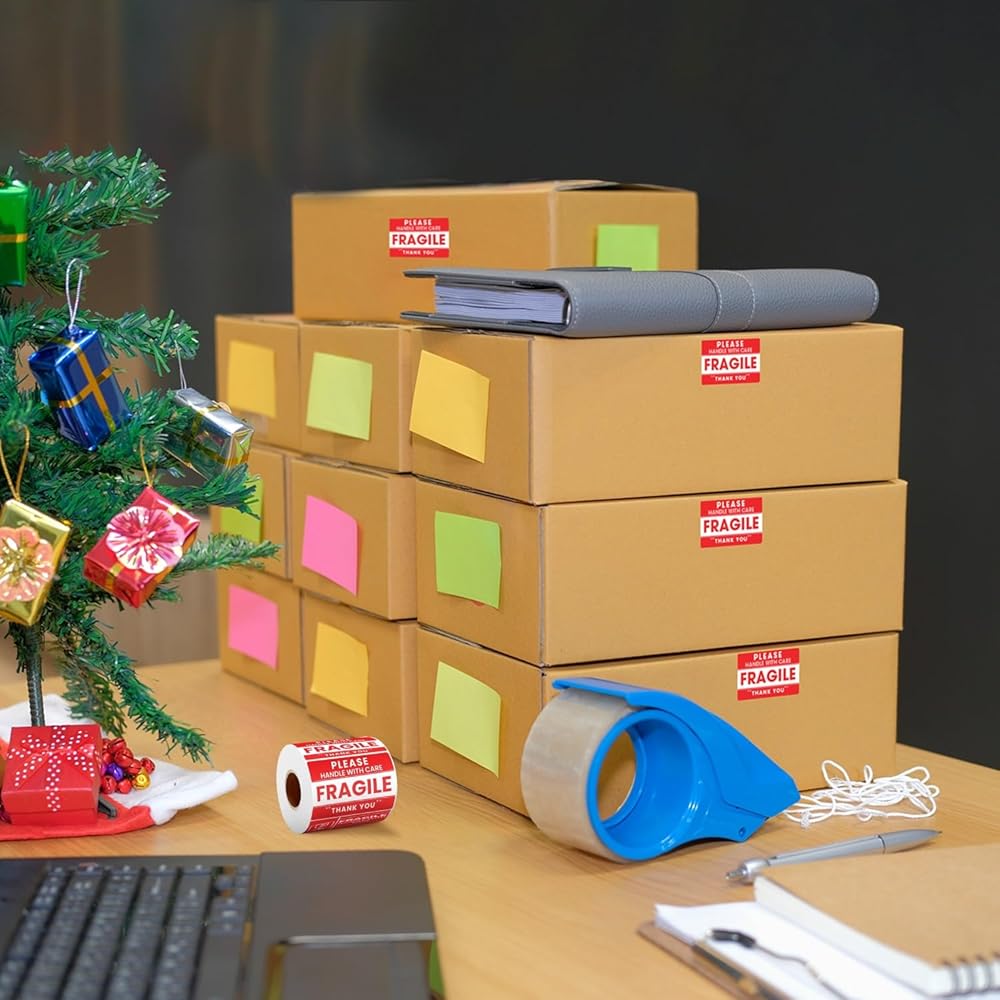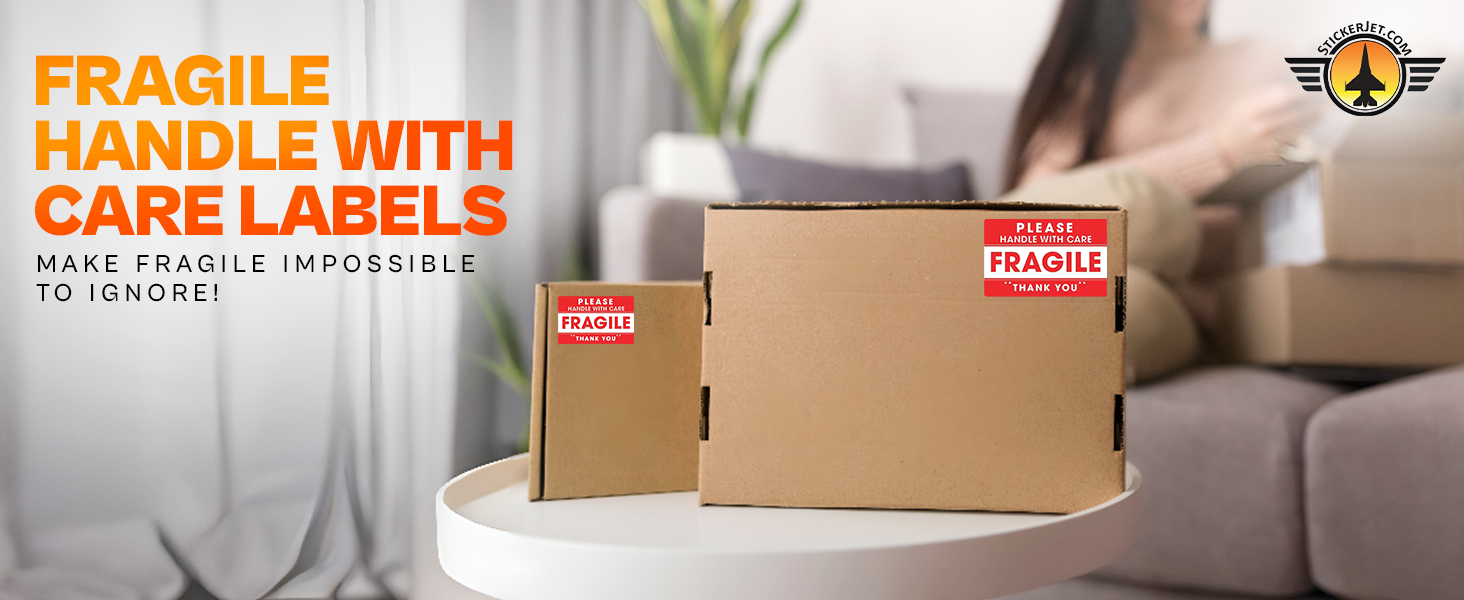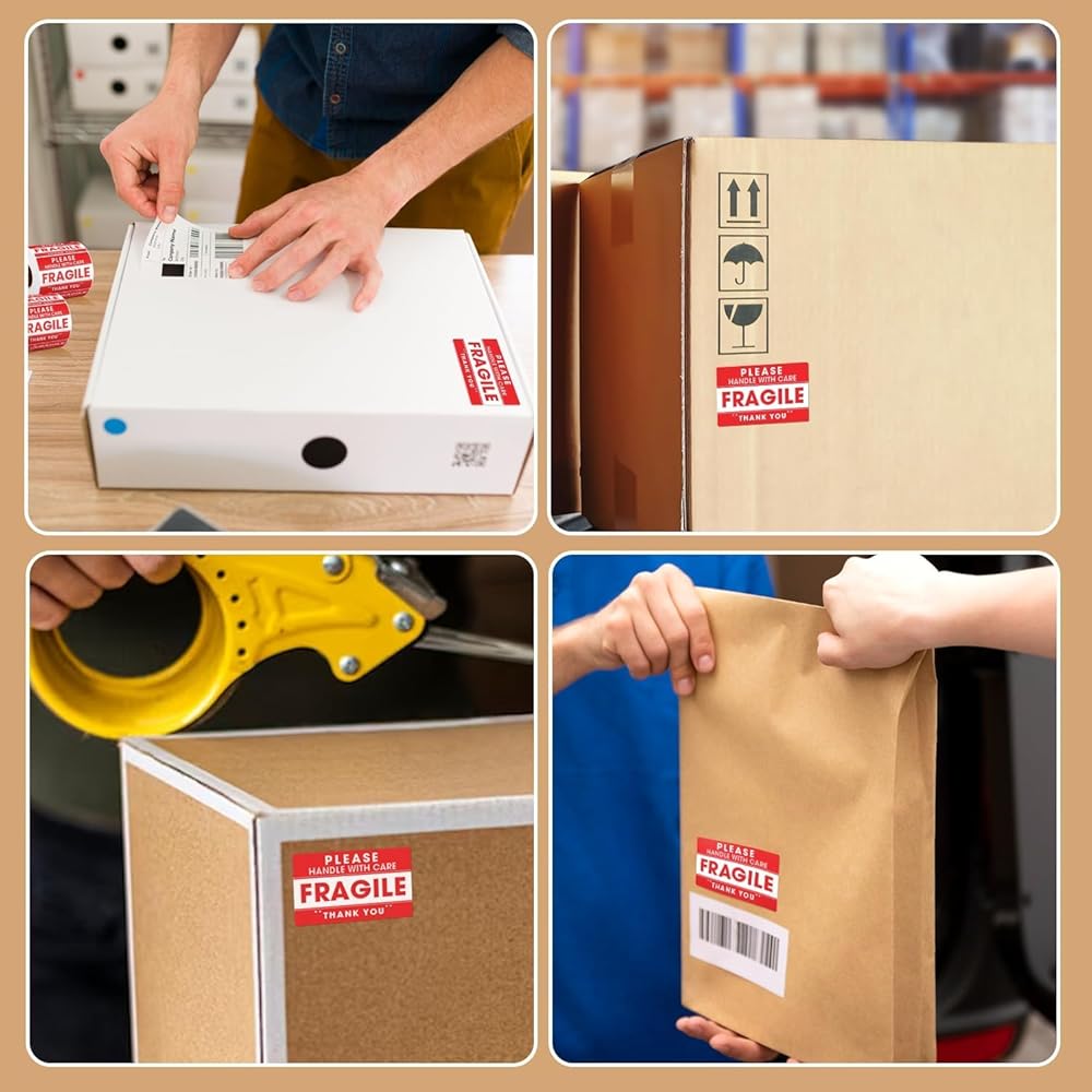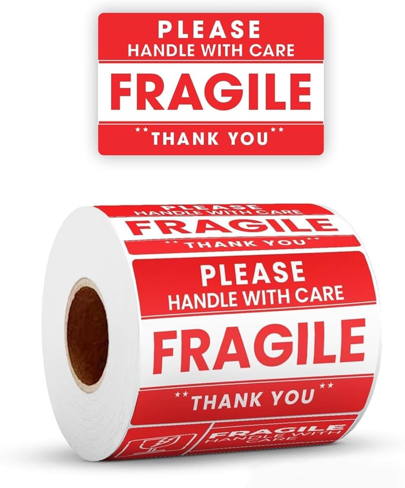 FRAGILE STICKERS FOR SHIPPING BOXES – Bright red "Fragile – Handle with Care" labels with bold lettering make your packaging stand out, helping couriers and handlers treat delicate packages more carefully.