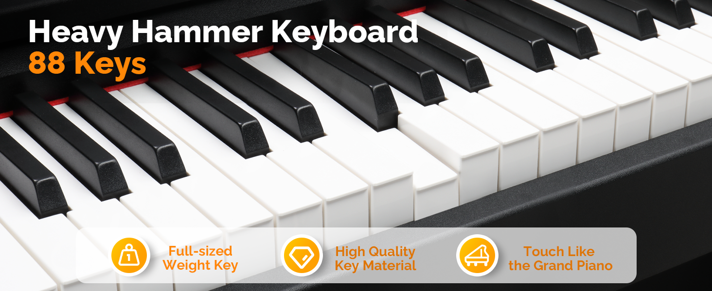 Heavy Hammer Keyboard:Designed with the high quality heavy hammer keyboard, is able to control different volume and timbre changes based on different intensity inputs, which makes the performance more vivid and expressive. These different changes help beginners adapt and progress faster. The durable keyboard can also be used for a longer period of time.