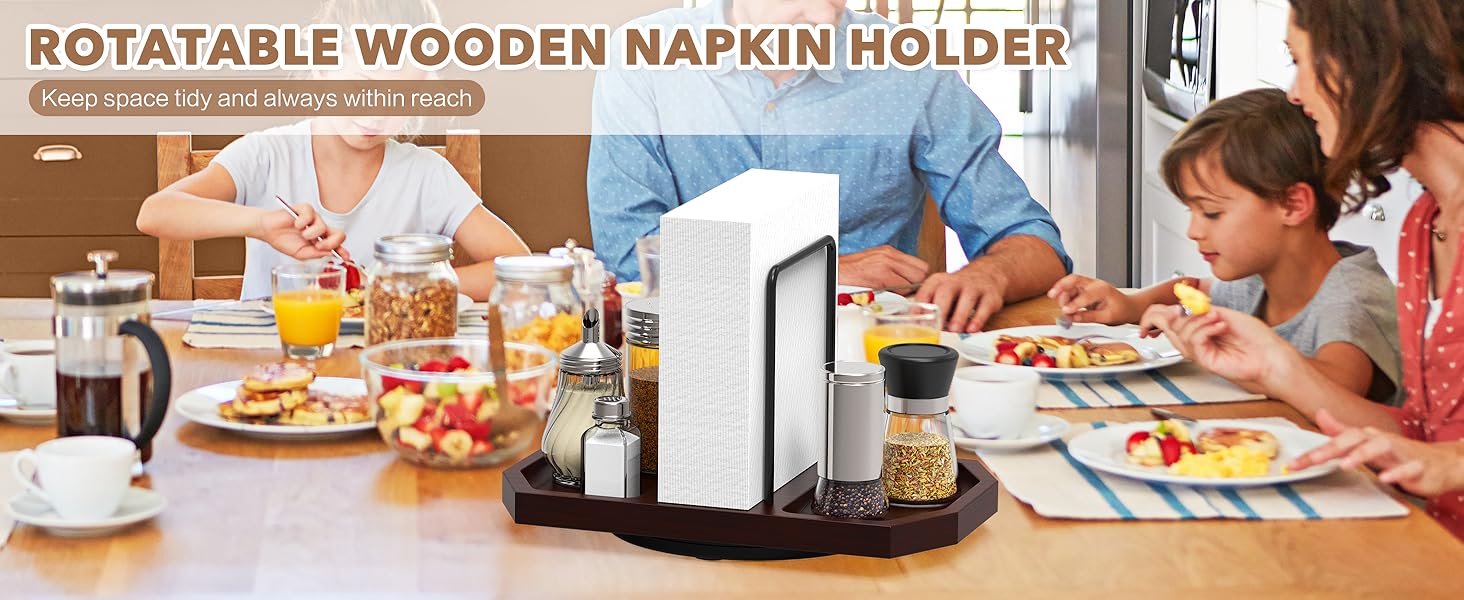 360° Rotating Base: The napkin holder features a smooth-swiveling turntable at the bottom, allowing easy access to napkins and seasoning jars quickly from any seat, perfect for busy dining tables. NOTE: Not including salt and pepper shakers