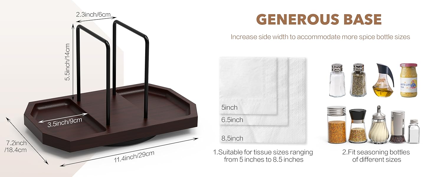 Multi-purpose Storage: The napkin dispenser holds most napkin sizes and seasoning bottles up to 3.5" wide, saving space and keeping your table tidy