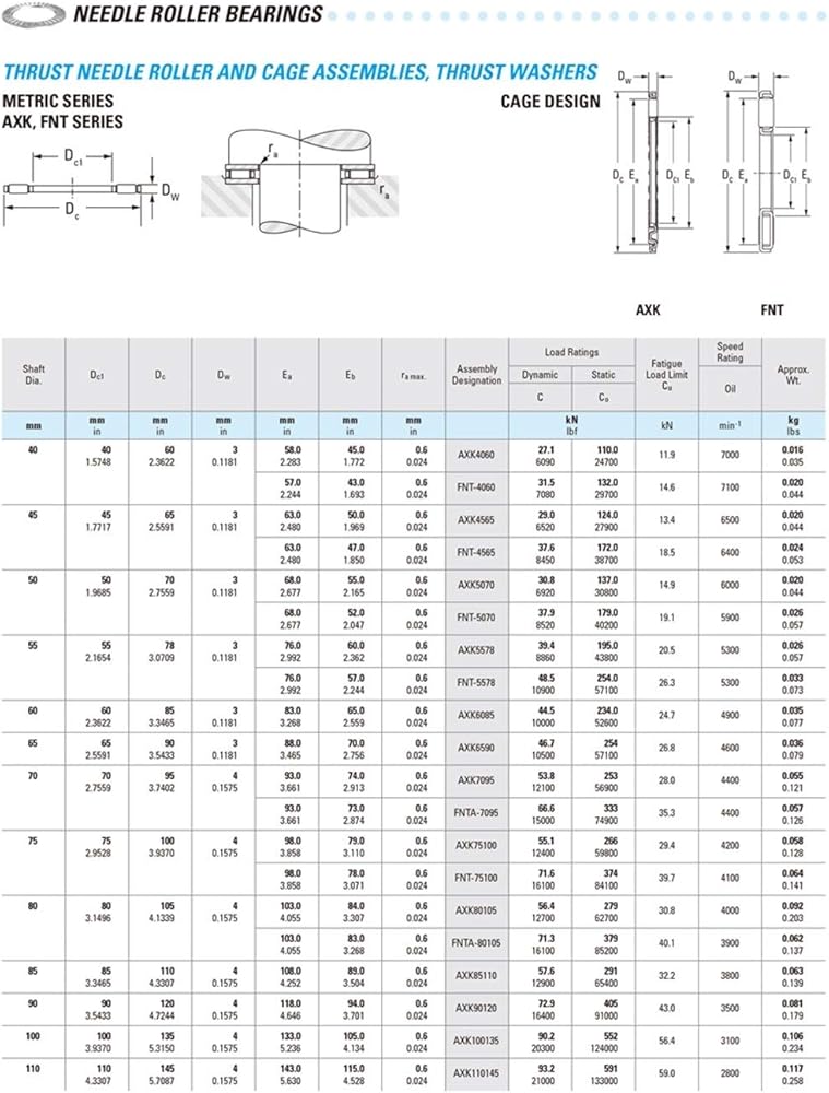 Slippage can occur if the applied axial load is too light and the operating speed of the thrust needle roller and cage assembly is high – particularly if accompanied by inadequate lubrication. For satisfactory operation a certain minimum load must be applied to a thrust needle roller and cage assembly which can be calculated from: Fa min = C0a/2200 [KN]