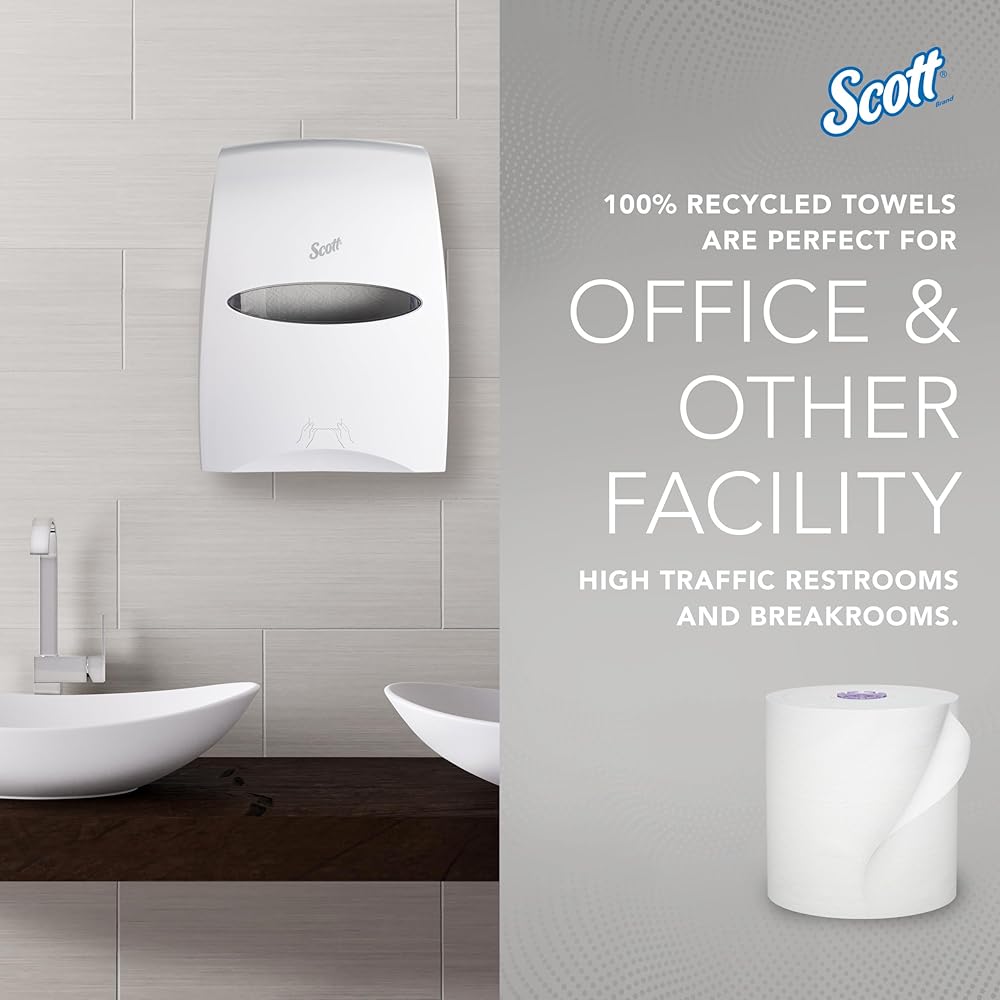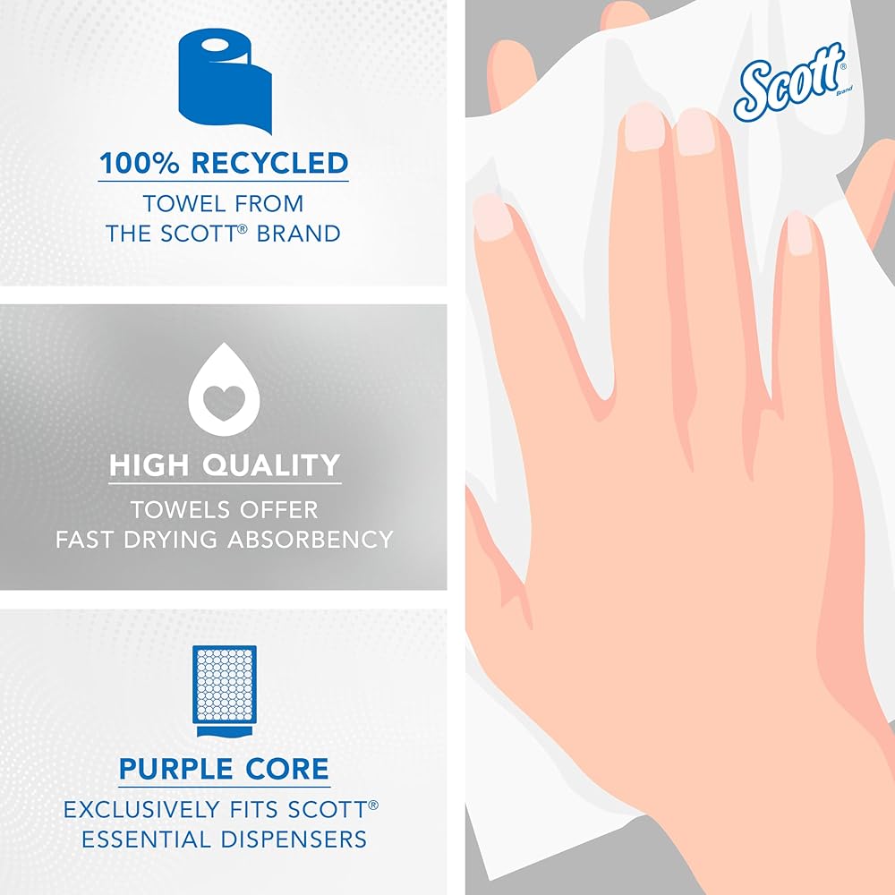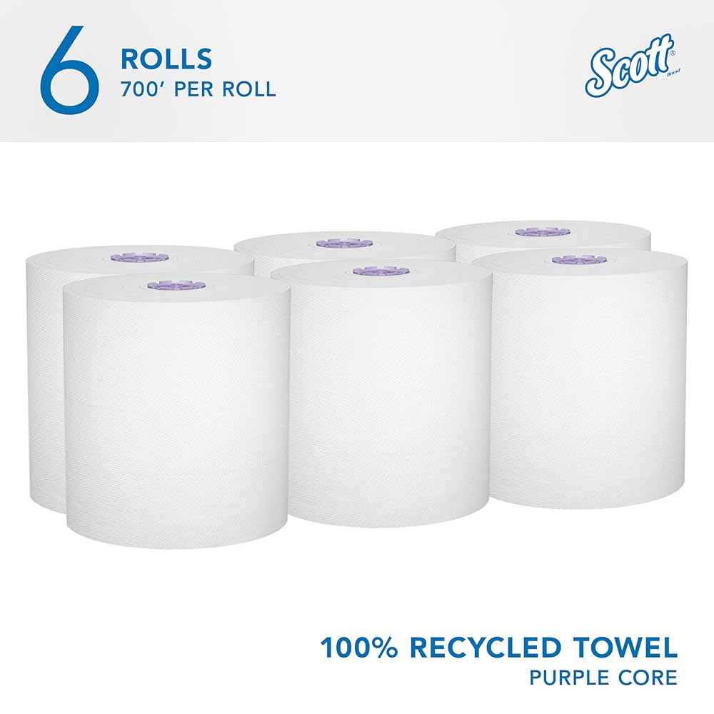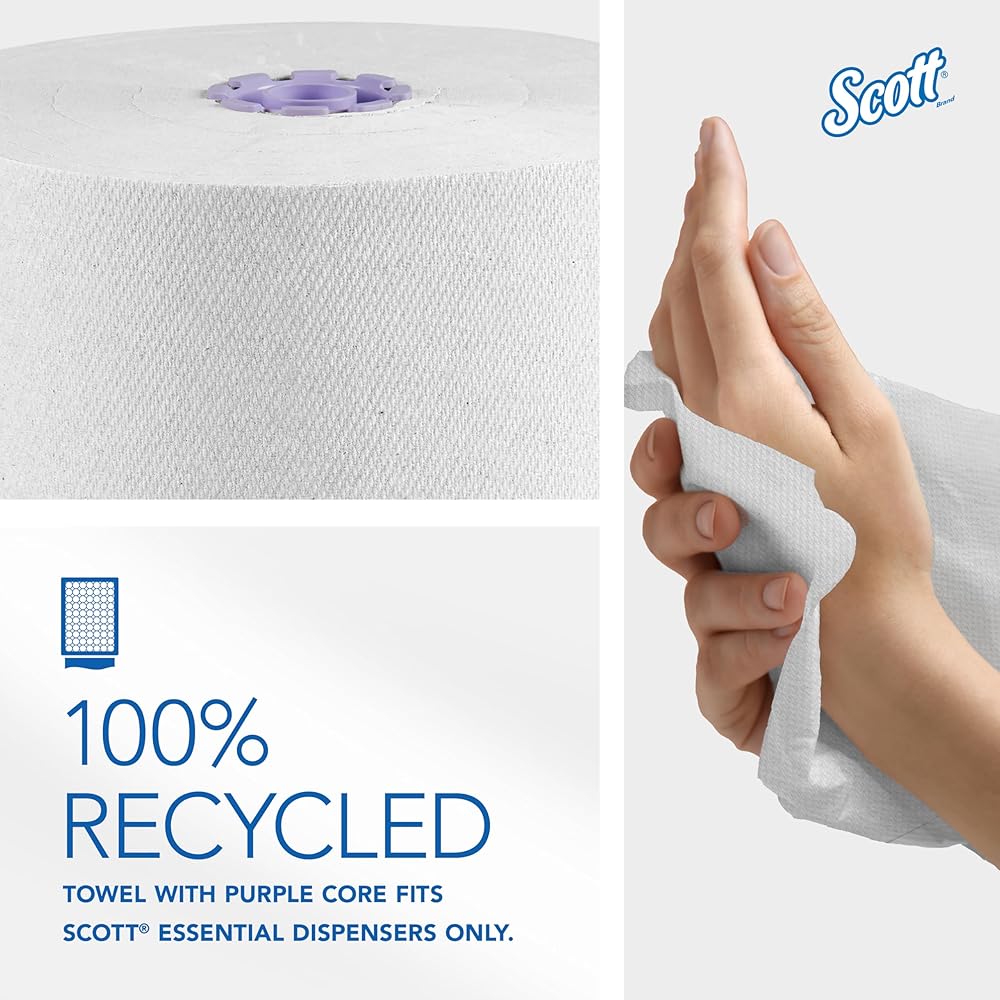 Scott® Essential provides a reliable balance of efficiency, performance and value. Scott® Essential 100% Recycled Hard Roll Paper Towels are an affordable, absorbent, high-quality solution -- an excellent choice for your business. With proprietary Absorbency Pockets™, the towel helps reduce waste because fewer towels are needed to dry hands effectively. Available in both brown and white paper sheets, these high-capacity commercial paper towel rolls are made with 100% recycled fiber and from one of the world's most trusted brands, Scott®. These absorbent recycled paper towels are designed for efficient general-purpose cleaning and drying, so your employees and guests will use less, saving you money.